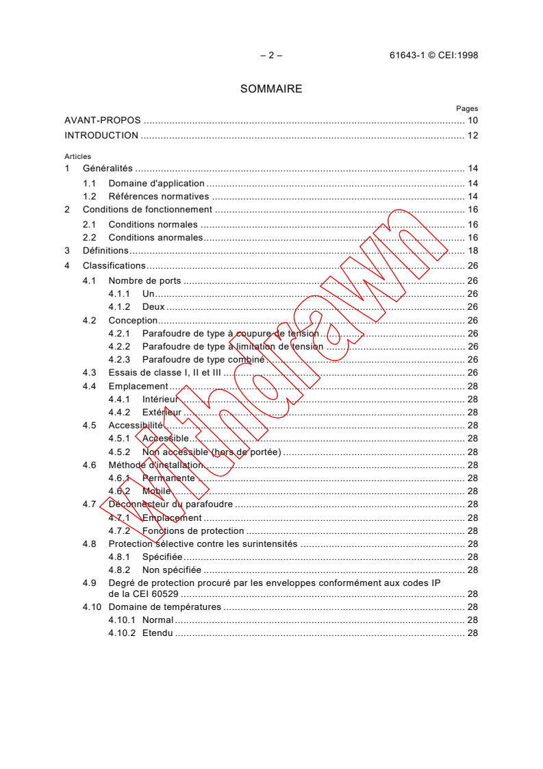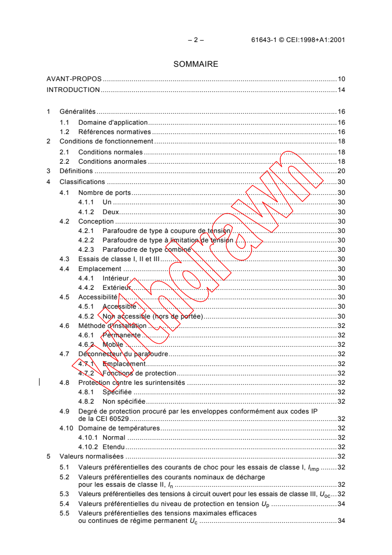Est applicable aux dispositifs de protection contre les effets directs et indirects de la foudre ou contre les surtensions transitoires. Ces dispositifs sont conçus pour être connectés à des circuits sous tension alternative 50/60 Hz ou sous tension continue et à des équipements de tension assignée efficace jusqu'à 1 000 V en courant alternatif ou 1 500 V en courant continu. Les caractéristiques de fonctionnement, les méthodes normalisées d'essais et les paramètres sont établis pour les dispositifs incluant au moins un composant non linéaire detiné à limiter les surtensions et à écouler les courants.