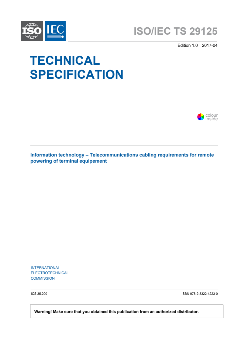 ISO/IEC TS 29125:2017 is a technical specification published by the International Electrotechnical Commission (IEC). Its full title is "Information technology - Telecommunications cabling requirements for remote powering of terminal equipment". This standard covers: ISO/IEC TS 29125:2017(E) This document specifies the use of generic balanced cabling for customer premises, as specified in the ISO/IEC 11801 series, for remote powering of terminal equipment. It provides guidance on new cabling installations and renovations. The customer premises may encompass one of more buildings or may be within a building that contains more than one organization. The cabling may be installed prior to the seelction of remote powering equipment or powered terminal equipment.