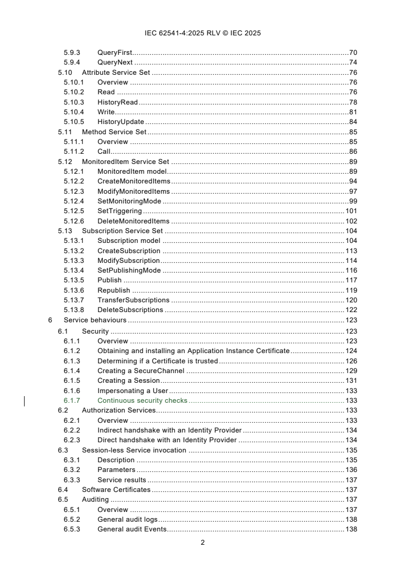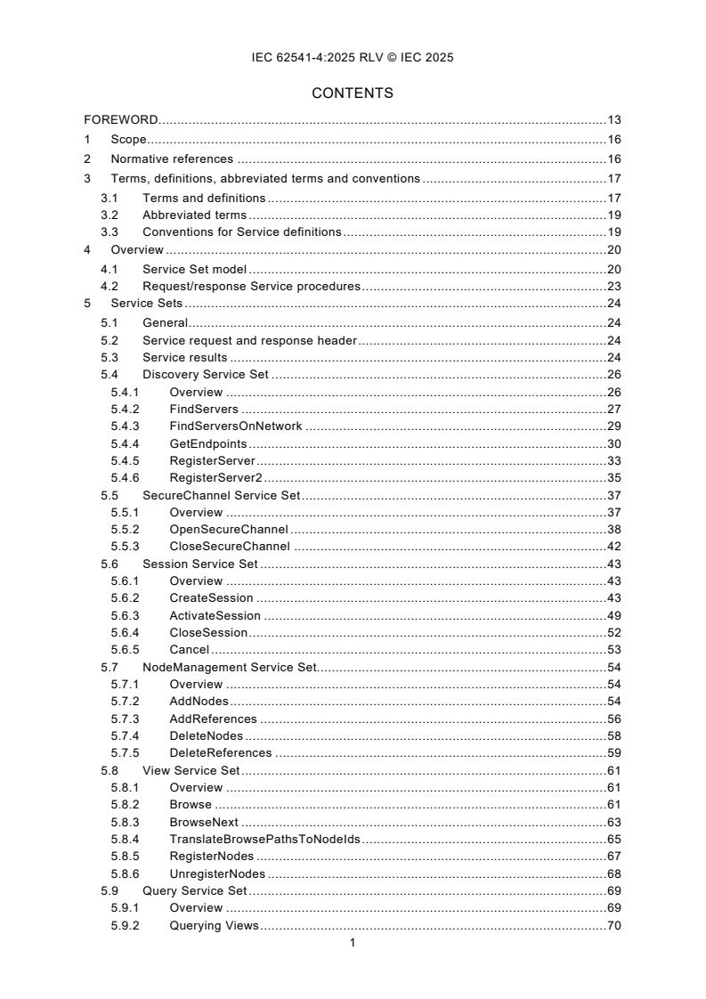 IEC 62541-4:2025 defines the OPC Unified Architecture (OPC UA) Services. The Services defined are the collection of abstract Remote Procedure Calls (RPC) that are implemented by OPC UA Servers and called by OPC UA Clients. All interactions between OPC UA Clients and Servers occur via these Services. The defined Services are considered abstract because no particular RPC mechanism for implementation is defined in this document. IEC 62541‑6 specifies one or more concrete mappings supported for implementation. For example, one mapping in IEC 62541‑6 is to UA-TCP UA-SC UA-Binary. In that case the Services described in this document appear as OPC UA Binary encoded payload, secured with OPC UA Secure Conversation and transported via OPC UA TCP. Not all OPC UA Servers implement all of the defined Services. IEC 62541‑7 defines the Profiles that dictate which Services must be implemented in order to be compliant with a particular Profile. A BNF (Backus-Naur form) for browse path names is described in Annex A. This fourth edition cancels and replaces the third edition published in 2020. This edition constitutes a technical revision. This edition includes the following significant technical changes with respect to the previous edition: a) addition of new definitions to Method Call Service to allow optional Method arguments; b)addition of reference to SystemStatusChangeEventType for event monitored item error scenarios; c) enhancement of the general description of how determining if a Certificate is trusted; d) addition of support for ECC; e) addition of revisedAggregateConfiguration to AggregateFilterResult structure; f) addition of INVALID to the BrowseDirection enumeration data type; g) addition of INVALID to the TimestampsToReturn enumeration data type; h) addition of definitions that make sure the subscription functionality works if retransmission queues are optional; i) addition of client checks has been added to be symmetric to the Server Certificate check has been added; j) clarification that ‘local’ top level domain is not appended by server into certificate and not checked by client when returned from LDS-ME; k) addition of a definition for expiration behaviour of IssuedIdentityTokens; l) addition of status code Good_PasswordChangeRequired to ActivateSession; m) restriction of AdditionalInfo to servers in debug mode; n) addition of new status code Bad_ServerTooBusy; o) addition of definition for cases where server certificate must be contained in GetEndpoints response.