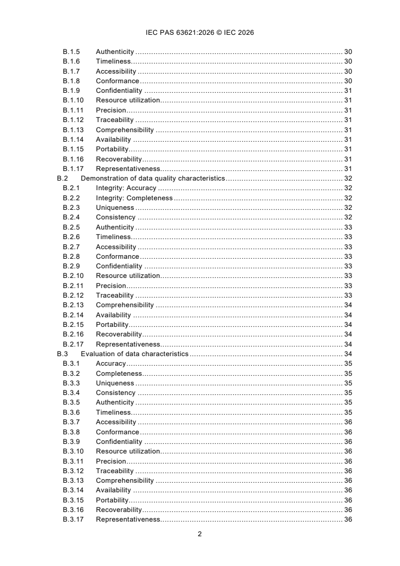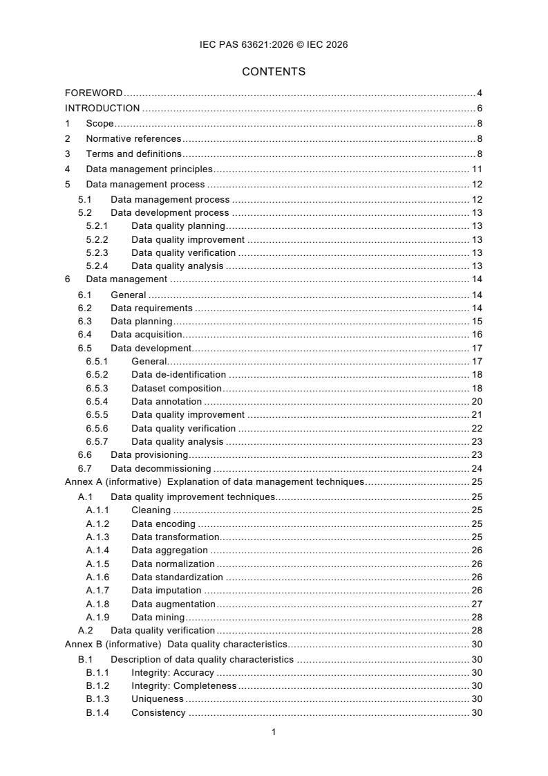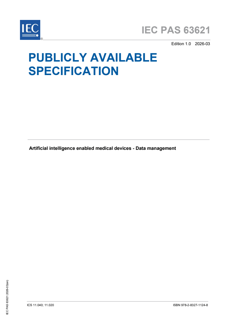 IEC PAS 63621:2026 is a technical specification published by the International Electrotechnical Commission (IEC). Its full title is "Artificial intelligence enabled medical devices - Data management". This standard covers: IEC PAS 63621:2025 provides a framework for the data life cycle processes for management of data used to train, test or validate an AI model that is part of a medical device. For data acquisition and management lifecycle the following considerations apply, amongst others: data suitability, data quality and integrity insurance, data privacy and security, data governance and documentation, data sampling and bias mitigation, data versioning and traceability, data storage and infrastructure, data access and sharing, and data labelling and annotation. This document outlines the requirements for the data lifecycle, covering stages from planning and acquisition to usage and decommissioning. It emphasizes maintaining data quality, including aspects such as dataset classification, data annotations, traceability, metadata comprehensiveness, representativeness, and validity periods. The scope is limited to the high-level process concepts applicable across medical specialties and device types and does not include specific requirements that can be covered by modality- or device-specific standards documents. This document outlines the additional requirements for a quality management system for data management, where an organization demonstrates its capability to manage data in accordance with applicable medical device guidance and standards. Organizations can be involved in one or more stages of the life-cycle, including design and development, production, storage and distribution, installation, or servicing and maintenance of a medical device that incorporates AI. This document can also be used by suppliers or external parties that provide data, including quality management system-related services to such organizations.