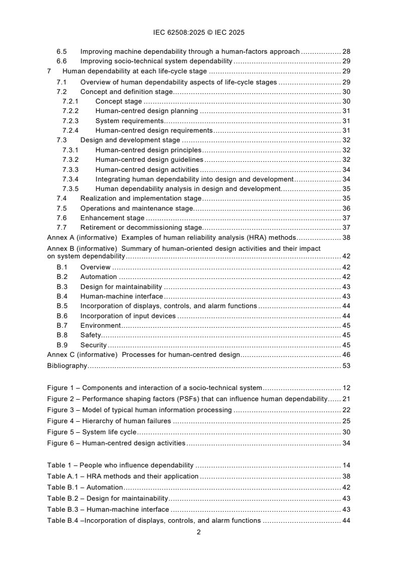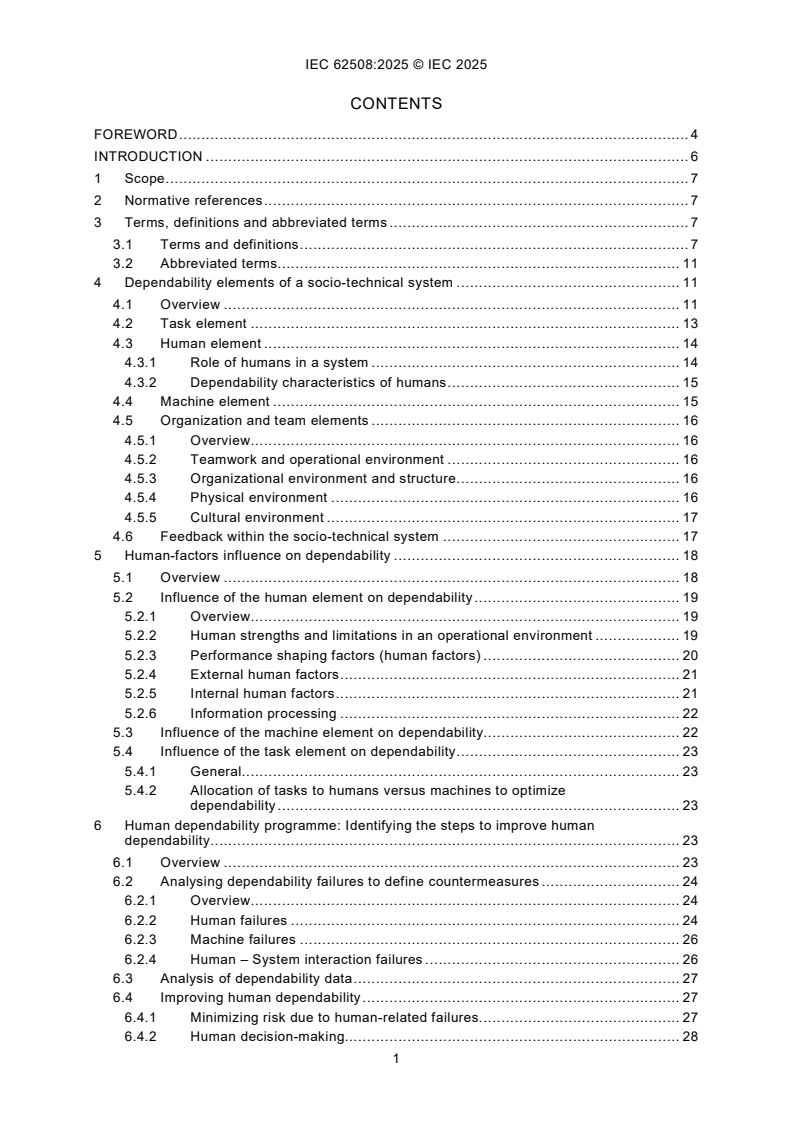 IEC 62508: 2025 provides guidance on current knowledge and practice concerning dependability in an operational environment, in terms of the humans, teams and organizations involved in conducting the work. It is part of a suite of IEC standards that are intended to address the dependability of both the technical and human elements of equipment and organizations. This document describes the human elements of a typical operational system, and the importance of those elements to overall dependability. It also describes the means of assessing how well these elements are functioning, and general concepts on how the reliability of humans can be improved. These elements typically include the individual workers, the groups or teams into which they are organized, the interfaces between humans and technical systems, and the overall organization. The following guidance is applicable to any industry that depends on human-systems interactions involving the technology, software, or systems of work required to support the production and safety objectives of an organization. This document primarily addresses complex technical systems, but some parts are also applicable to the manufacturing of industrial and consumer products. Principles for design of the human-machine interface (usability) are described, and further information can be found in the technical literature and in relevant product standards. Although this document does not specifically cover worker health or safety, the application of this document can raise related issues, particularly in process safety, which is closely associated with system reliability. This second edition cancels and replaces the first edition published in 2010. This edition constitutes a technical revision. This edition includes the following significant technical changes with respect to the previous edition: a) The emphasis on user-centred design in the previous edition was reduced in favour of a greater emphasis on human dependability in an existing operational environment. b) The emphasis on human error and error-rate determination methods was reduced in favour of a greater emphasis on means of providing organizational support for the workforce in their execution of required tasks. c) Where appropriate, discussions of human factors in an operational environment were aligned with current theory, terminology and practice.