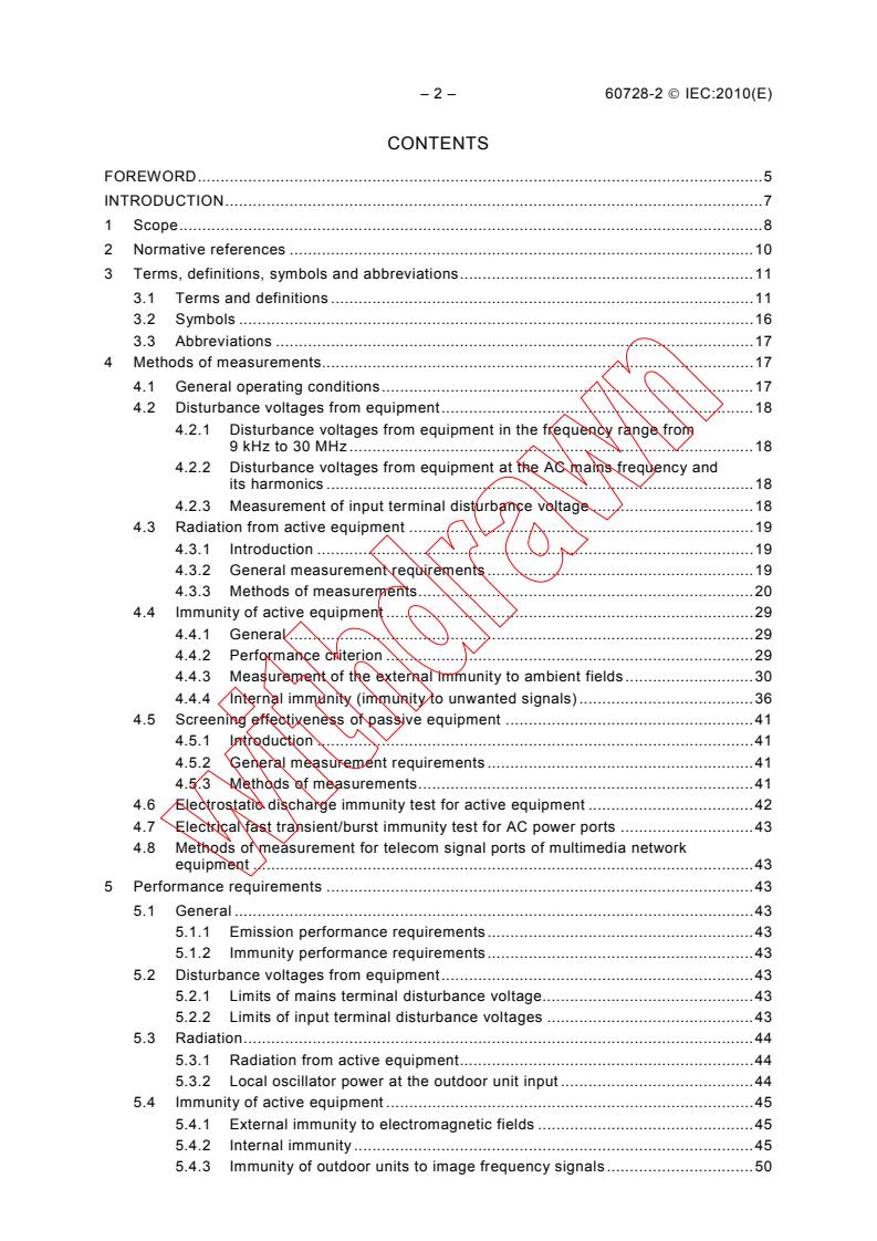 IEC 60728-2:2010 is a standard published by the International Electrotechnical Commission (IEC). Its full title is "Cable networks for television signals, sound signals and interactive services - Part 2: Electromagnetic compatibility for equipment". This standard covers: IEC 60728-2:2010(E) applies to the radiation characteristics and immunity to electromagnetic disturbance of EM active equipment (active and passive equipment) for the reception, processing and distribution of television, sound and interactive multimedia signals as dealt with in the IEC 60728 series. It specifies requirements for maximum allowed radiation, minimum immunity and minimum screening effectiveness and describes test methods for conformance testing. It cancels and replaces the first edition published in 2002, of which it constitutes a technical revision and includes the following significant technical changes with respect to the previous edition: - updated scope, added some new terms and definitions; - added methods of measurement and performance requirements for telecom signal ports of multimedia network equipment; - updated methods of measurement for immunity and emissions; - applicability of EMC performance requirements and methods of measurement to different types of equipment.