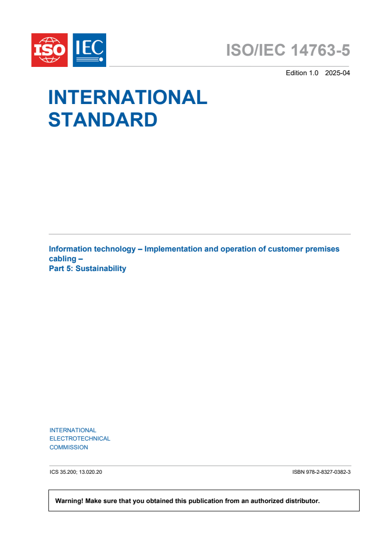 ISO/IEC 14763-5:2025 is a standard published by the International Electrotechnical Commission (IEC). Its full title is "Information technology – Implementation and operation of customer premises cabling – Part 5: Sustainability". This standard covers: ISO/IEC 14763-5:2025 specifies requirements and recommendations to maximize the sustainability of cabling systems including both customer premises infrastructure and the accommodation of information technology equipment by addressing the a) cabling design; b) selection, packaging and transportation of components and related materials; c) installation, operation and maintenance; d) management of waste materials, and e) skill sets necessary for designers, installers and users.