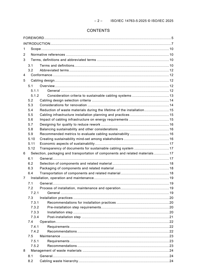 ISO/IEC 14763-5:2025 specifies requirements and recommendations to maximize the sustainability of cabling systems including both customer premises infrastructure and the accommodation of information technology equipment by addressing the a) cabling design; b) selection, packaging and transportation of components and related materials; c) installation, operation and maintenance; d) management of waste materials, and e) skill sets necessary for designers, installers and users.