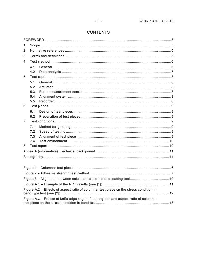 IEC 62047-13:2012 specifies the adhesive testing method between micro-sized elements and a substrate using the columnar shape of the specimens. This international standard can be applied to adhesive strength measurement of microstructures, prepared on a substrate, with width and thickness of 1 μm to 1 mm, respectively. This standard specifies the adhesive testing method for micro-sized-elements in order to optimally select materials and processing conditions for MEMS devices. This standard does not particularly restrict test piece material, test piece size and performance of the measuring device, since the materials and size of MEMS device components range widely and testing machine for micro-sized materials has not been generalized.