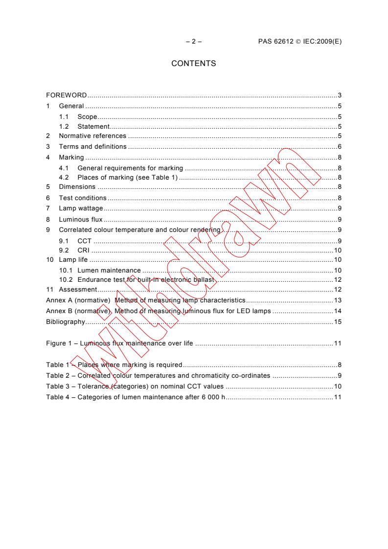 IEC/PAS 62612:2009(E) specifies the performance requirements for self-ballasted LED lamps with a supply voltage up to 250 V, together with the test methods and conditions required, intended for domestic and similar general lighting purposes, having: - a rated wattage up to 60 W; - a rated voltage of up to 250 V AC or DC.