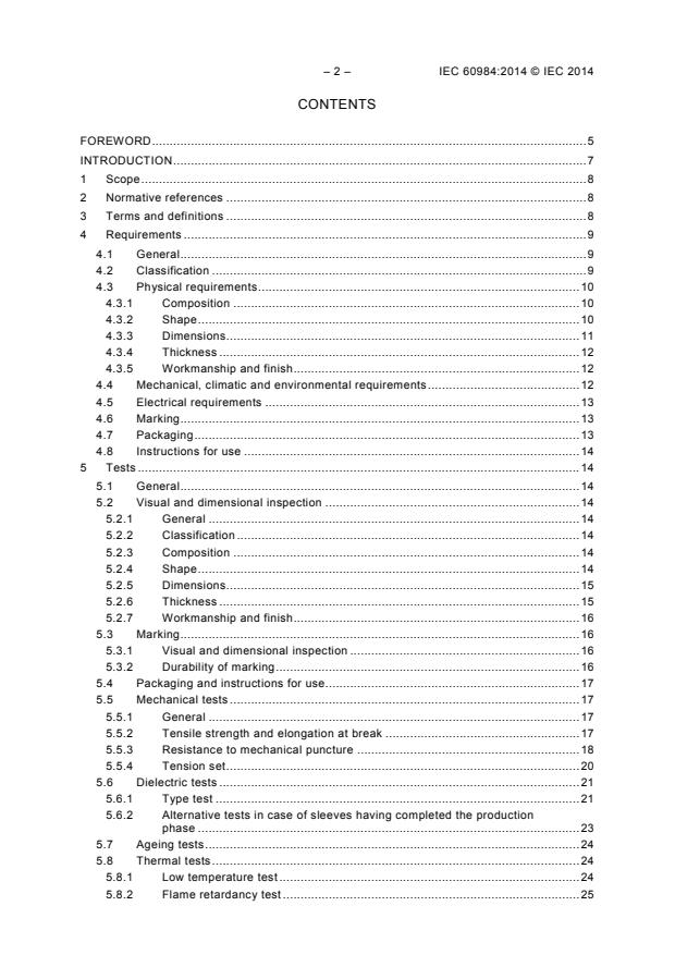 IEC 60984:2014 is a standard published by the International Electrotechnical Commission (IEC). Its full title is "Live working - Electrical insulating sleeves". This standard covers: IEC 60984:2014 is applicable to electrical insulating sleeves for the protection of workers from accidental contact with live electrical conductors, apparatus or circuits. The products designed and manufactured according to this standard contribute to the safety of the users provided they are used by skilled persons, in accordance with safe methods of work and the instructions for use. Unless otherwise stated, in this standard the term "sleeve" is used for "electrical insulating sleeve". This second edition cancels and replaces the first edition, published in 1990 and its Amendment 1 published in 2002. It constitutes a technical revision which includes the following major changes: - removal of the requirement for an area to mark the date of inspection; - only the straight mounting method with water electrodes is specified for the dielectric type test; - the d.c. electric tests are no longer included in the normative part of the document, but a new informative Annex E is added; - preparation of the elements of evaluation of defects, and general application of IEC 61318:2007; - in the new normative Annex F, updating of the characteristics of the liquid specified for tests on sleeves of category H, according to the latest edition of ISO 1817; - introduction of a new normative Annex G on classification of defects; - introduction of a new informative Annex H on the rationale for the classification of defects; - and for periodic electrical retesting, recommended voltage limit of the dielectric test methods to 10 kV except in case of the test method with water electrodes and straight mounting.