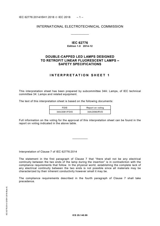 IEC 62776:2014 is a standard published by the International Electrotechnical Commission (IEC). Its full title is "Double-capped LED lamps designed to retrofit linear fluorescent lamps - Safety specifications". This standard covers: IEC 62776:2014 specifies the safety and interchangeability requirements, and the exchange operation together with the test methods and conditions required to show compliance of double-capped LED lamps with G5 and G13 caps, intended for replacing fluorescent lamps with the same caps, having: - a rated power up to 125 W; - a rated voltage up to 250 V. The contents of the corrigendum of March 2015 and interpretation sheet 1 of June 2018 have been included in this copy.
