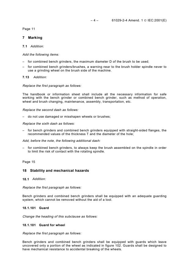Keywords: IEC 61029-2-4, bench grinder safety standard, transportable motor-operated electric tools, combined bench grinders, safety requirements, grinding wheel, spark arrestor, transparent screen, dust collection, IEC amendment 2001, tool guarding, mechanical hazard prevention, electrical tool safety.