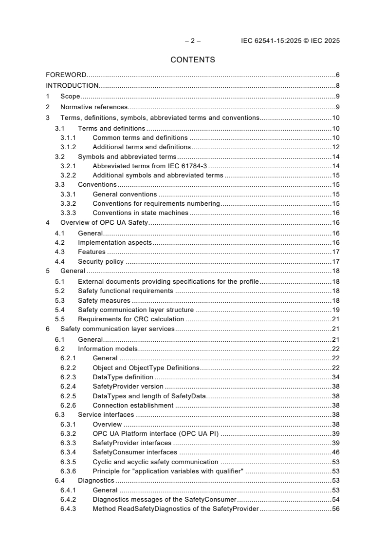 IEC 62541-15:2025 describes a safety communication layer (services and a protocol) for the exchange of SafetyData using IEC 62541 mechanisms. It identifies the principles for functional safety communications defined in IEC 61784‑3 that are relevant for this safety communication layer. This safety communication layer is intended for implementation in safety devices only. NOTE 1 This document targets controller-to-controller communication. However, easy expandability to other use-cases (e.g. OPC UA field level communication) has already been considered in the design of this document. NOTE 2 This document does not cover electrical safety and intrinsic safety aspects. Electrical safety relates to hazards such as electrical shock. Intrinsic safety relates to hazards associated with potentially explosive atmospheres. This document defines mechanisms for the transmission of safety-relevant messages among participants within a network using OPC UA technology in accordance with the requirements of the IEC 61508 series and IEC 61784-3 for functional safety. These mechanisms can be used in various industrial applications such as process control, manufacturing, automation, and machinery. This document provides guidelines for both developers and assessors of compliant devices and systems. NOTE 3 The resulting SIL claim of a system depends on the implementation of this document within the system – implementation of this document in a standard device is not sufficient to qualify it as a safety device.