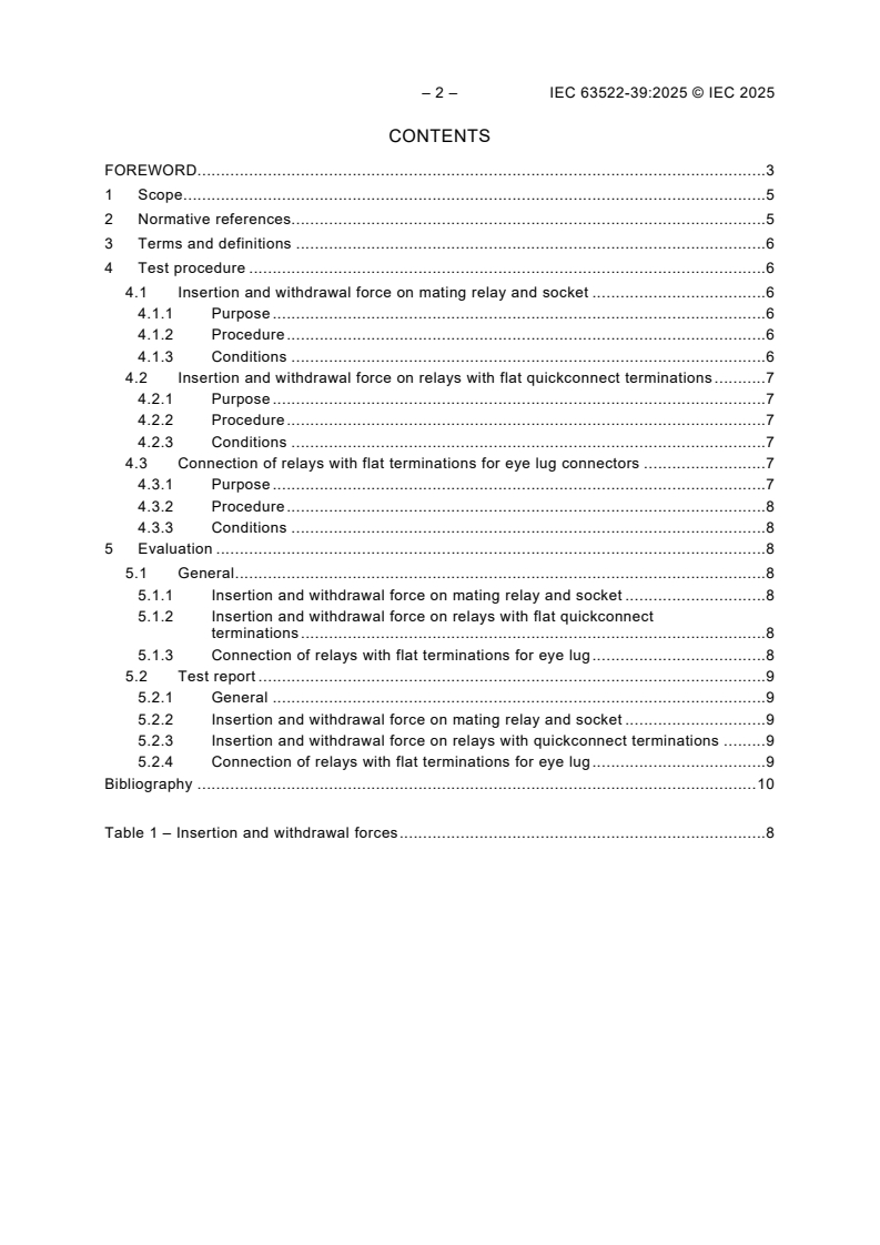 IEC 63522-39:2025 is used for testing all kind of relays and shall evaluate their ability to perform under expected conditions of transportation, storage and all aspects of operational use. This document defines standard test methods for: 1. measuring the insertion and withdrawal forces of the mating relay and socket; 2. measuring the insertion and withdrawal forces on relays with flat quickconnect terminations; 3. verifying the correct connection of flat terminals with eye lug connectors.