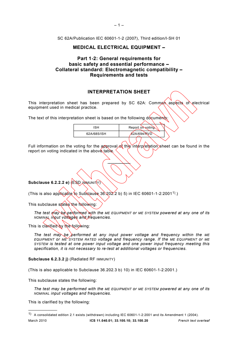 This collateral standard applies to electromagnetic compatibility of medical electrical equipment and medical electrical systems. The object of this collateral standard is to specify general requirements and tests for electromagnetic compatibility of medical electrical equipment and medical electrical systems. They are in addition to the requirements of the general standard and serve as the basis for particular standards. This edition of IEC 60601-1-2 was revised to structurally align it with the 2005 edition of IEC 60601-1 and to implement the decision of IEC subcommittee 62A that the clause numbering structure of collateral standards written to IEC 60601-1:2005 would adhere to the form specified in ISO/IEC Directives, Part 2:2004. The principle technical changes are in Clause 4, which now recognizes that there is a general requirement for a risk management process in IEC 60601-1:2005. The contents of the interpretation sheet of March 2010 have been included in this copy.