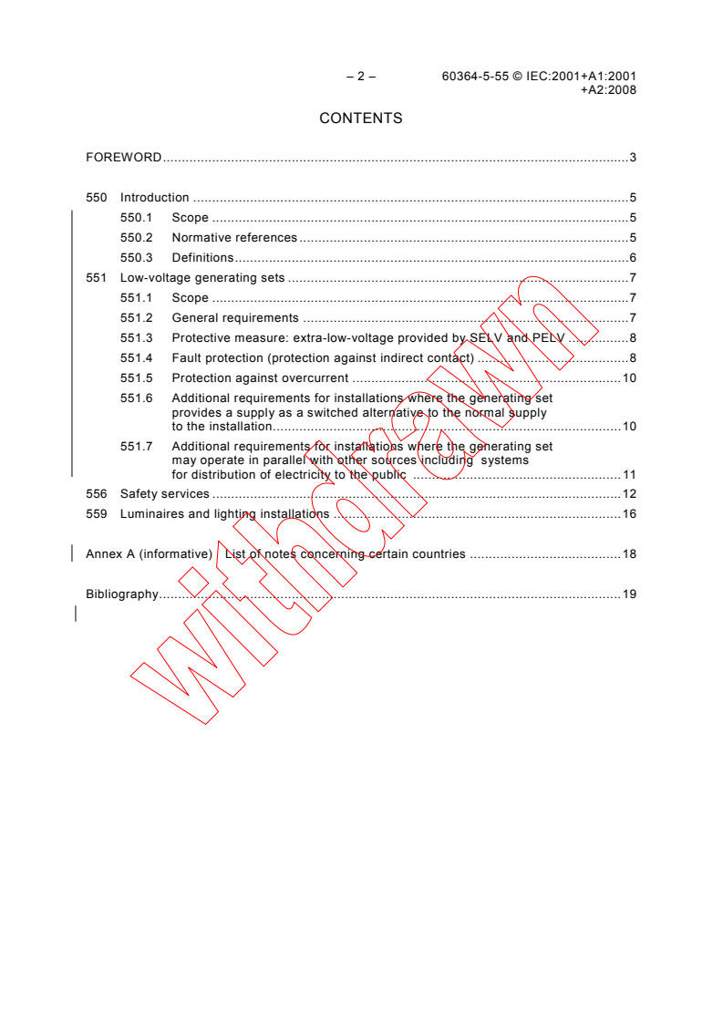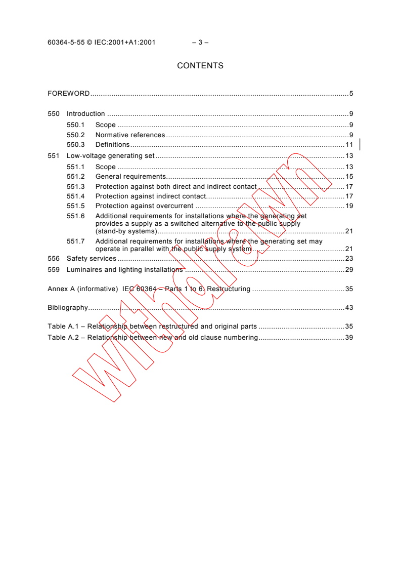IEC 60364-5-55:2001 is a standard published by the International Electrotechnical Commission (IEC). Its full title is "Electrical installations of buildings - Part 5-55: Selection and erection of electrical equipment - Other equipment". This standard covers: Covers requirements for low-voltage generating sets. Particular require-ments for supplies for safety services are given in clause 556 while clause 559 applies to the selection and erection of luminaires and lighting installations intended to be part of the fixed installation.