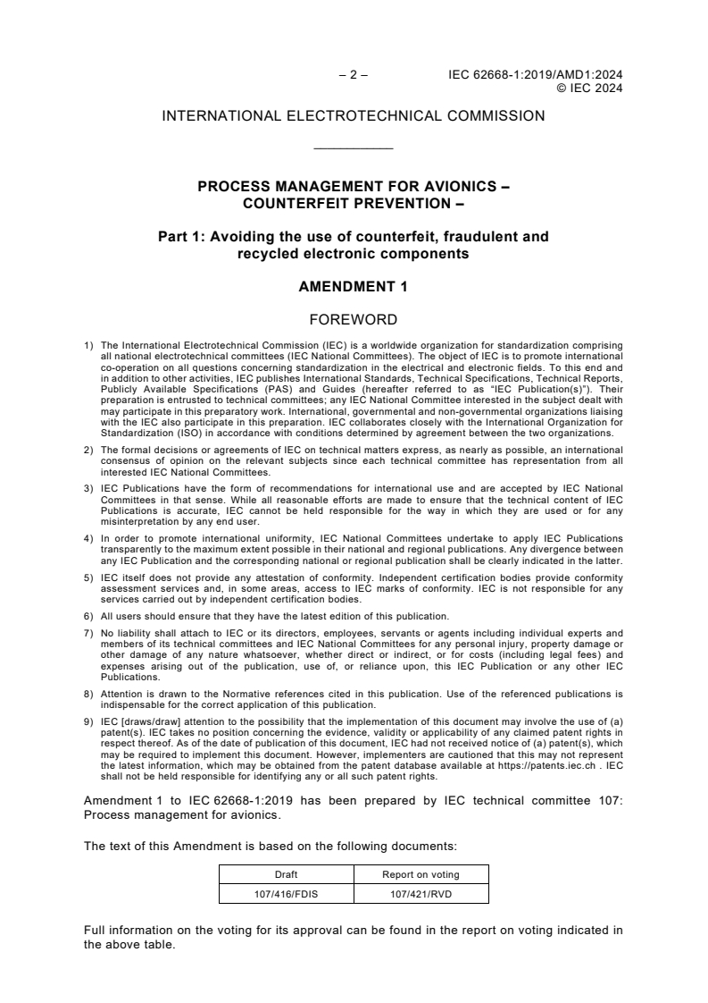 IEC 62668-1:2019/AMD1:2024 is the latest amendment to the International Electrotechnical Commission (IEC) standard focused on process management for avionics with emphasis on counterfeit prevention. This amendment updates Part 1 of the standard titled "Avoiding the use of counterfeit, fraudulent and recycled electronic components." It reflects modern requirements and best practices to ensure avionics manufacturers and operators prevent counterfeit electronic components from entering the supply chain, thereby enhancing the reliability, safety, and integrity of avionics systems worldwide.