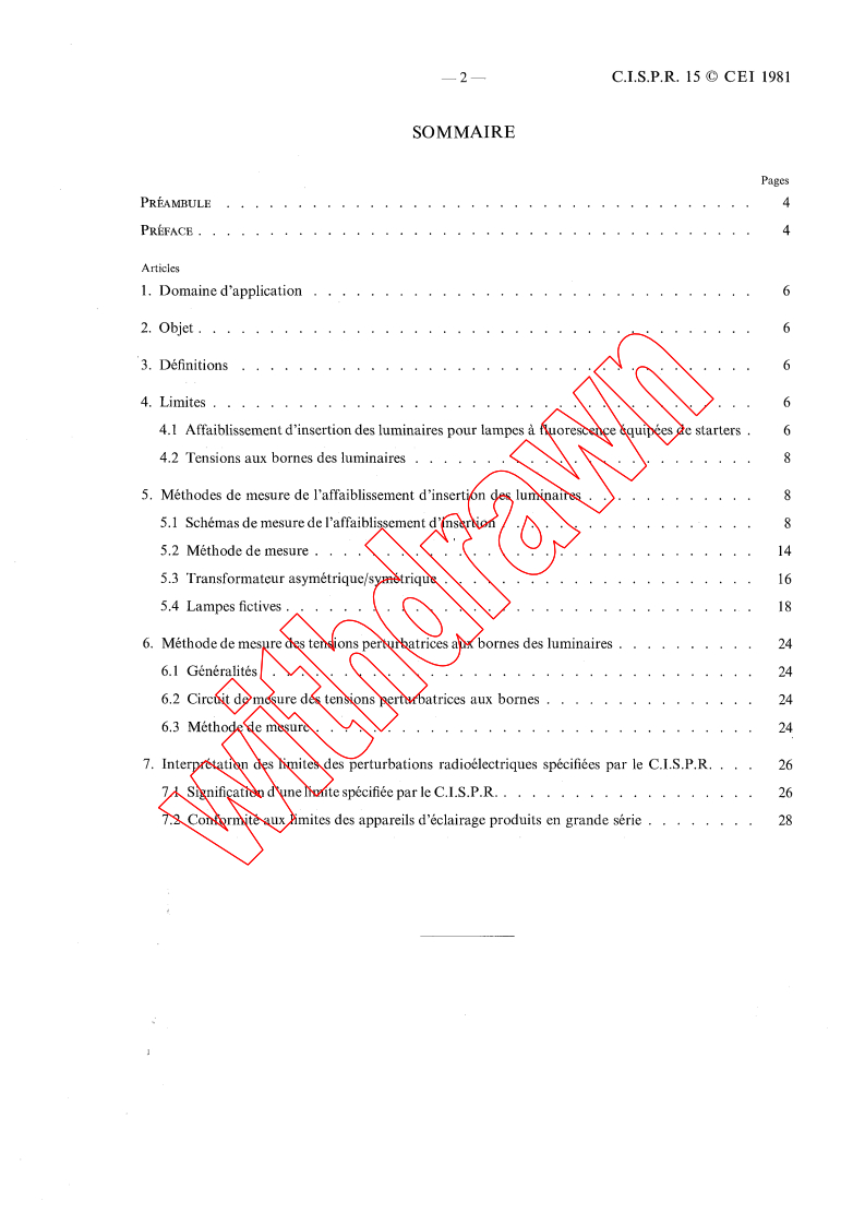 CISPR 15:1981 is a standard published by the International Electrotechnical Commission (IEC). Its full title is "Limits and methods of measurement of radio interference characteristics of fluorescent lamps and luminaires". This standard covers: Limits and methods of measurement of radio interference characteristics of fluorescent lamps and luminaires
