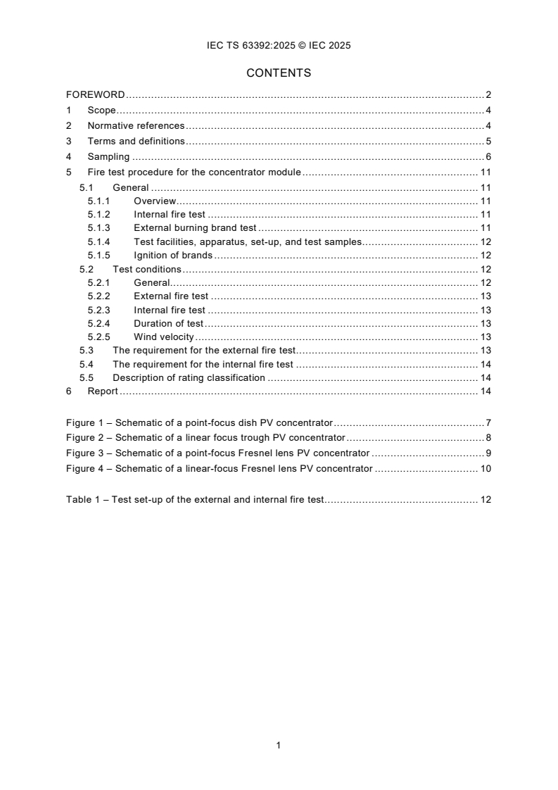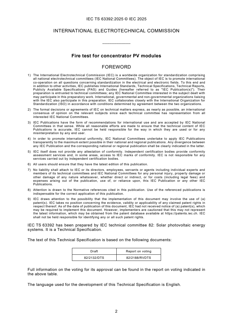 IEC TS 63392:2025 specifies a test method for evaluating the basic fire behaviour of modules used in concentrating systems with a maximum DC system voltage of 1 500 V or less. Since the concentrator module may be exposed to flames due to flying embers or fire may be caused by the module itself due to hot spots or arching (internal fire), the tests outlined in this document are conducted in these two modes.
