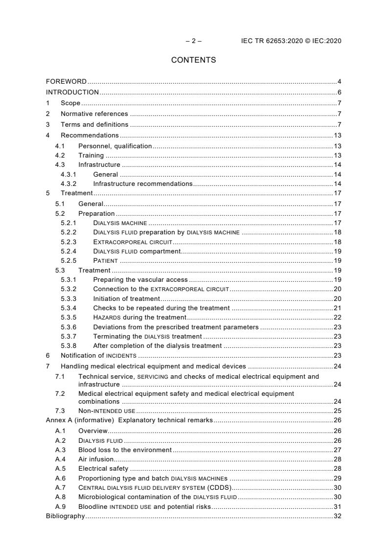 IEC TR 62653:2020 describes the technical recommendations for use of medical equipment in chronic Haemodialysis, Haemofiltration and Haemodiafiltration. These principles are important to be complied with to ensure safe, permissible and appropriate application. The term Haemodialysis is used in this document as synonym for all therapy modalities. The scope can be applicable to the use of the medical equipment in home, acute and pediatrics environment. The scope may also be applicable to Sorbent Dialysis Systems. The physician is responsible for the treatment prescription. However, the Organization administering the treatment is responsible for all resources, structures and processes used in connection with the treatment. These responsibilities will not be described here. The requirements of IEC 60601-2-16 ensure that medical electrical equipment used for extracorporeal renal replacement therapy operates with a high level of safety. Despite that high level of safety, however, some residual risk remains, related to medical-biological, physical-chemical and technical Hazards. The Organization administering the treatment is responsible for managing the residual risk. This document is not intended to be used as the basis of regulatory inspection or certification assessment activities. IEC TR 62653:2020 cancels and replaces the first edition published in 2012. This edition constitutes a technical revision. This edition includes the following significant technical changes with respect to the previous edition: a) update the relevant references to the new numbering scheme of the ISO 23500 family; b) alignment with IEC 60601-1:2005 and IEC 60601-1:2005/AMD1:2012, IEC 62353:2014 and 60601-2-16:2018; c) technical additions in several sections.