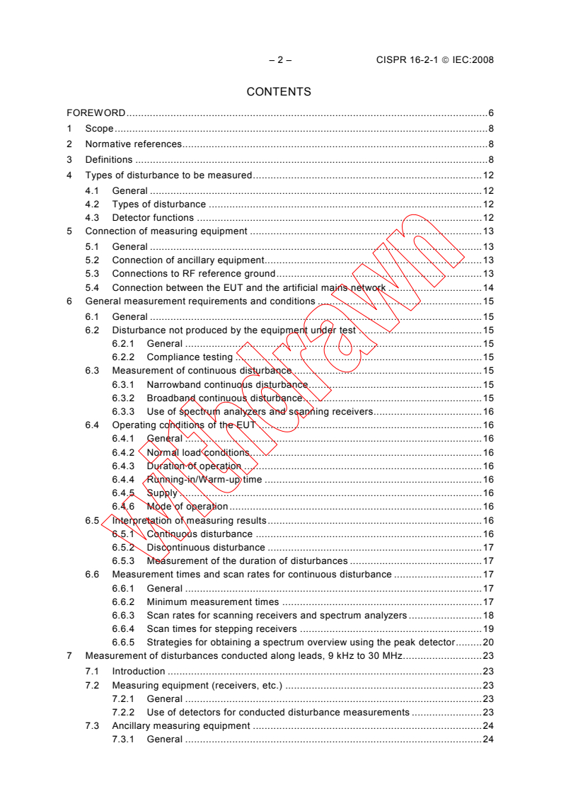 La CISPR 16-2-1:2008 spécifie les méthodes de mesure des phénomènes perturbateurs en général, dans la gamme de fréquences de 9 kHz à 18 GHz et spécialement les perturbations conduites dans la gamme de fréquences de 9 kHz à 30 MHz. Cette deuxième édition de la CISPR 16-2-1 annule et remplace la première édition (2003) et son Amendement 1 (2005) et constitue une révision technique. La CISPR 16-2-1:2008 inclut des modifications techniques majeures par rapport à l'édition précédente. De manière générale, cette nouvelle édition a pour objectif de réduire l'incertitude de conformité, en connexion avec les conclusions de la CISPR 16-4-1. Des indications sont fournies sur:
