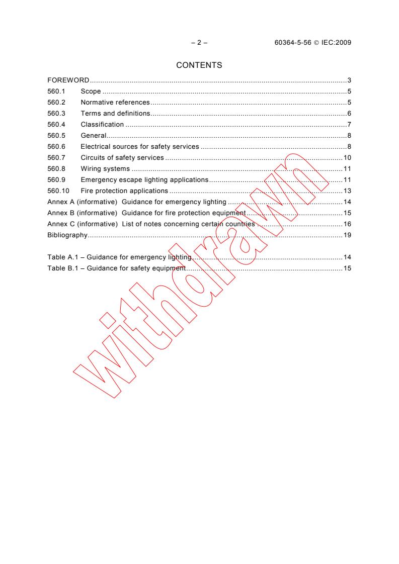 IEC 60364-5-56:2009 is a standard published by the International Electrotechnical Commission (IEC). Its full title is "Low-voltage electrical installations - Part 5-56: Selection and erection of electrical equipment - Safety services". This standard covers: IEC 60364-5-56:2009 covers general requirements for safety services, selection and erection of electrical supply systems for safety services and electrical safety sources. Standby electrical supply systems are outside the scope of this part. This part does not apply to installations in hazardous areas (BE3), for which requirements are given in IEC 60079-14. This second edition of IEC 60364-5-56 comes about as a result of changes to Clause 556, Safety services, of IEC 60364-5-55 (2001), as modified by its amendment 1 (2001). It replaces Clause 556 of IEC 60364-5-55:2001. Clause 556 is to be withdrawn at the time of publication of this new Part 56. The main changes with regard to the previous edition are listed below: 1) Many more definitions are included, e.g. response time, central power supply system, low power supply system, preferential circuit and escape route. 2) Automatic supplies are now classified according to the maximum changeover times, for example a supply classified as short break means an automatic supply is available within 0,5 s. 3) Safety sources that can operate in parallel are specifically recognized in 560.6.9. 4) Requirements are now given for batteries used for safety sources for central and low power supply sources. 5) Drawings are now required, such as a single-line diagram, drawings showing the location of equipment and a list of equipment permanently connected to the safety power supply. 6) Operating instructions are now required. 7) Detailed requirements are now given for emergency escape lighting applications, direct current circuits and fire protection applications. 8) Additional requirements for initial verification and periodic inspection and testing are now included in the standard. 9) Two annexes are now included (Annex A and Annex B) giving guidance for emergency lighting and guidance for fire protection equipment, respectively.