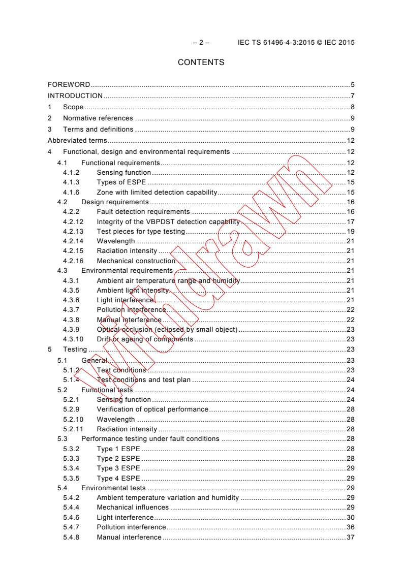 Keywords: IEC TS 61496-4-3:2015, electro-sensitive protective equipment, ESPE, vision based protective devices, VBPD, stereo vision, VBPDST, safety of machinery, detection zone, tolerance zone, type testing, light interference.