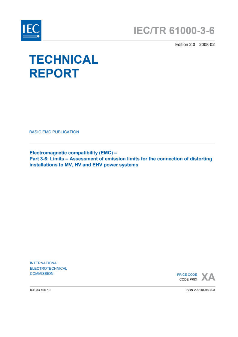 IEC TR 61000-3-6:2008 is a key Technical Report issued by the International Electrotechnical Commission (IEC) focusing on electromagnetic compatibility (EMC) in electrical power systems. Specifically, it provides guidance for the assessment and determination of emission limits for the connection of distorting installations-such as loads or generators that produce harmonics and interharmonics-to medium voltage (MV), high voltage (HV), and extra-high voltage (EHV) public power systems. Low voltage (LV) installations are addressed by other IEC standards.