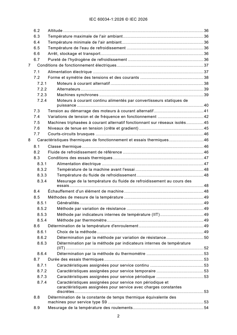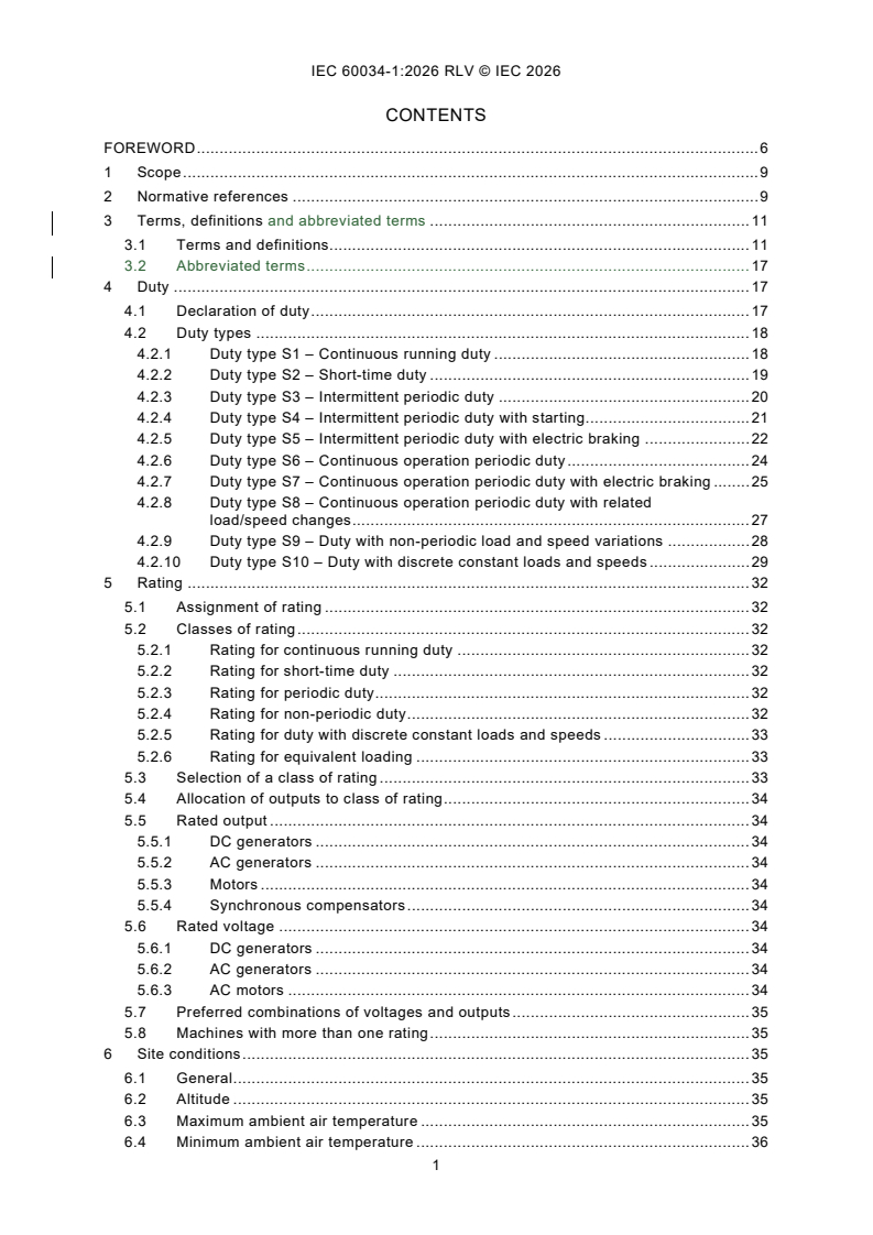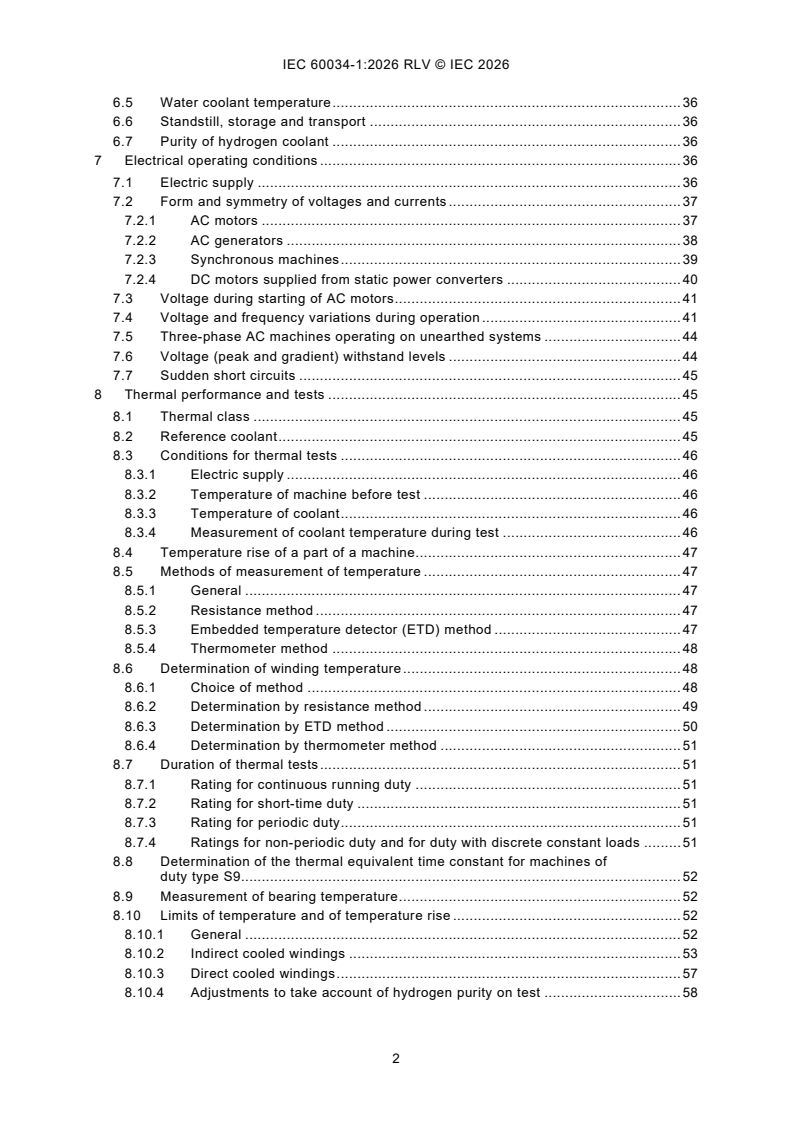 IEC 60034-1:2026 is available as IEC 60034-1:2026 RLV which contains the International Standard and its Redline version, showing all changes of the technical content compared to the previous edition.IEC 60034-1:2026 is applicable to all rotating electric machines, except rotating electric machines for rail and road vehicles, which are covered by the IEC 60349 series of standards. Machines with integrated EMC-active components such as a variable frequency converter are considered being a power drive system (see the IEC 61800 series of standards). In such cases, this document applies to the motor component of the power drive system only. Machines within the scope of this document can also be subject to superseding, modifying or additional requirements in other standards, for example, IEC 60079 and IEC 60092. NOTE If particular clauses of this document are modified to meet special applications, for example machines subject to radioactivity or machines for aerospace, all other clauses apply insofar as they are compatible. This fifteenth edition cancels and replaces the fourteenth edition published in 2022. This edition constitutes a technical revision. This edition includes the following significant technical changes with respect to the previous edition: Clause 1: Clarification with respect to machines with integrated EMC-active components added Clause 2: Normative references updated Clause 3: Note on meaning of “agreement” deleted; list of abbreviations added Clause 4.2.9, 4.2.10: References to IEC TS 60034-25 deleted, as converter duty is now defined in 3.36 Clause 5.1: Reference to IEC TS 60034-25 converted into note Clause 6.6 Clarification of requirements Clause 7.2.1: Reference to IEC TS 60034-25 converted into note Clause 7.5: Clarification of requirements Clause 7.6: Reference to IEC TS 60034-25 converted into note Clause 8.1: Clarification of references Clause 8.6.1: Clarification on choice of method for large machines Table 11: Updated values for thermal class 200 (N) Clause 8.10.3: Clarification of requirements Clause 9.2: Clarification on test voltage for old machines after rewinding Table 17: Items 9 and 10 merged and clarified Clause 9.7: Clarification on overspeed test for machines held at stock added Table 20: Clarification on test speed for converter duty machines Clause 10.2: Clarification of term ‘digital form’ Clause :10.3 Note on QR code deleted Clause 11.1: Reference to protective earth test added Clause 13.1: Clarifying flowchart added Clause 13.2.2: Clarification on motors with integrated VSD added Clause 13.3: Clarification of requirements after consultation with ACEC Clause 13.5: Clarification of requirements after consultation with ACEC Clause 14: Note on safety converted to normal text