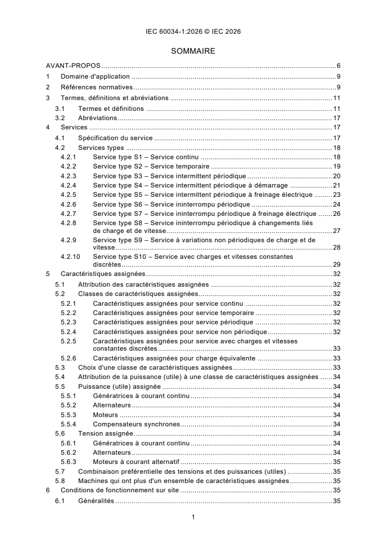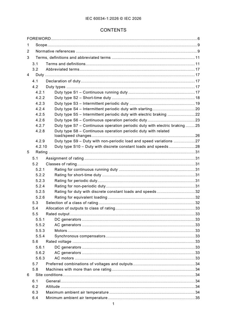 IEC 60034-1:2026 is available as IEC 60034-1:2026 RLV which contains the International Standard and its Redline version, showing all changes of the technical content compared to the previous edition.IEC 60034-1:2026 is applicable to all rotating electric machines, except rotating electric machines for rail and road vehicles, which are covered by the IEC 60349 series of standards. Machines with integrated EMC-active components such as a variable frequency converter are considered being a power drive system (see the IEC 61800 series of standards). In such cases, this document applies to the motor component of the power drive system only. Machines within the scope of this document can also be subject to superseding, modifying or additional requirements in other standards, for example, IEC 60079 and IEC 60092.