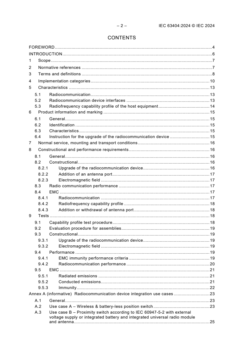 IEC 63404:2024 defines radiocommunication related requirements for equipment intended to integrate a radiocommunication device. It includes the initial integration and update of a the radiocommunication device, having a carrier frequency greater than 380 MHz, into new or updated host equipment with: - The classification of integration categories; - The EMC immunity verification using a capability profile approach; - The verification of the unwanted emission level of the radio transceiver.
