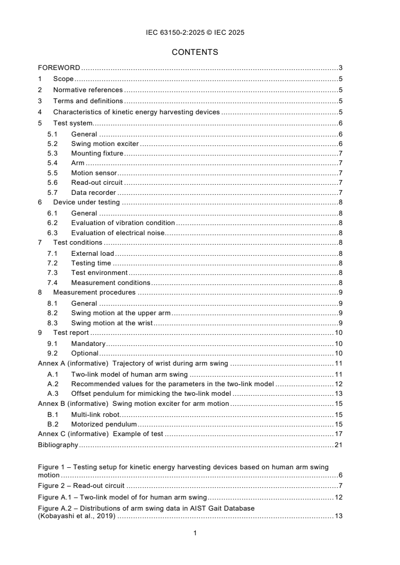 Keywords: IEC 63150-2:2025, kinetic energy harvesting, human arm swing motion, wearable energy harvester, low‑frequency vibration, rotor eccentric mass, electromagnetic, piezoelectric, triboelectric, swing motion exciter, DUT test methods.