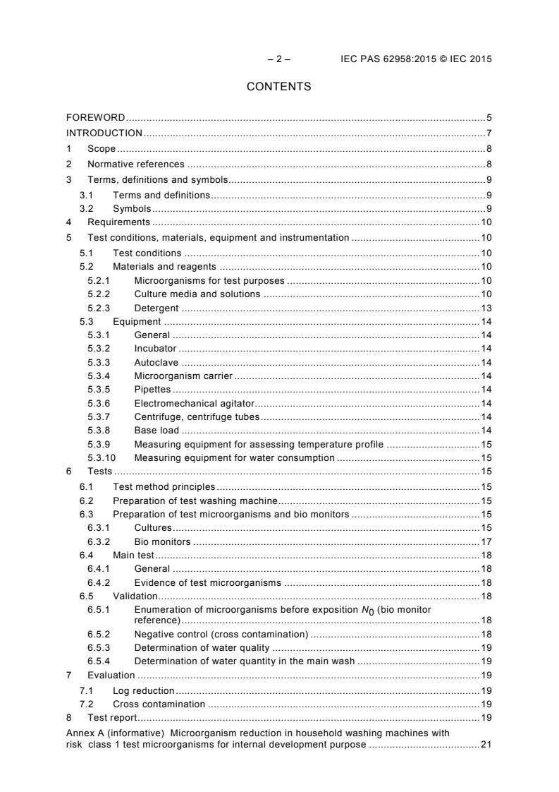 IEC PAS 62958:2015 is a technical specification published by the International Electrotechnical Commission (IEC). Its full title is "Clothes washing machines for household use - Method for measuring the microbial contamination reduction". This standard covers: IEC PAS 62958:2015(E) specifies a test method for measuring the reduction of microbial contamination in clothes washing machines and of the possible cross contamination to uncontaminated load. This PAS applies to clothes washing machines for household use, with or without heating devices utilising cold and/or hot water supply. It also covers washing machines which specify the use of no detergent for normal use. This PAS applies also to washing machines for communal use in blocks of flats or in launderettes. This PAS does not deal with professional washing machines nor with commercial laundry operations associated with food service, hospital linens or other non-residential applications. It also does not address the needs of persons with specific health conditions requiring special sanitization and/or disinfection techniques. This PAS does not specify safety requirements and does not deal with performance of washing machines measured under IEC 60456 nor with effects on fabrics.