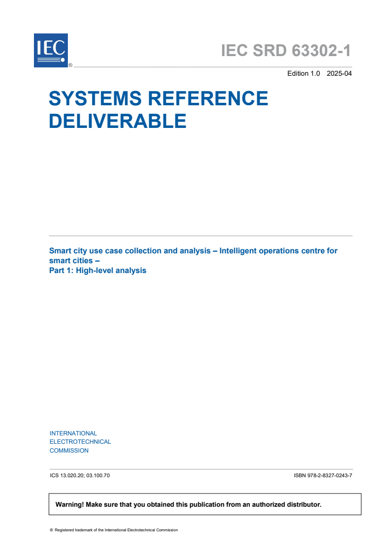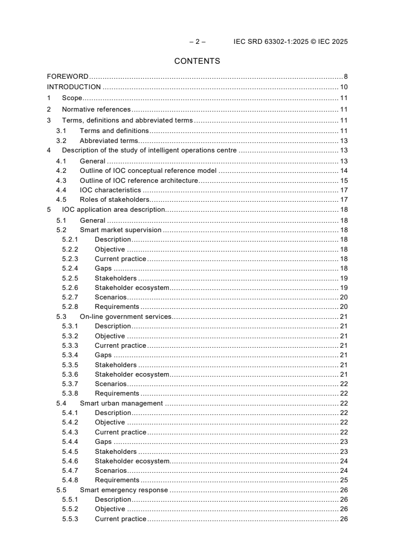 IEC SRD 63302-1:2025 provides use case collection and analysis, identifies the market relationships of relevant stakeholders, scopes out capabilities and a reference model of intelligent operations centre (IOC) for smart cities, and proposes the requirements for standards development in this field.