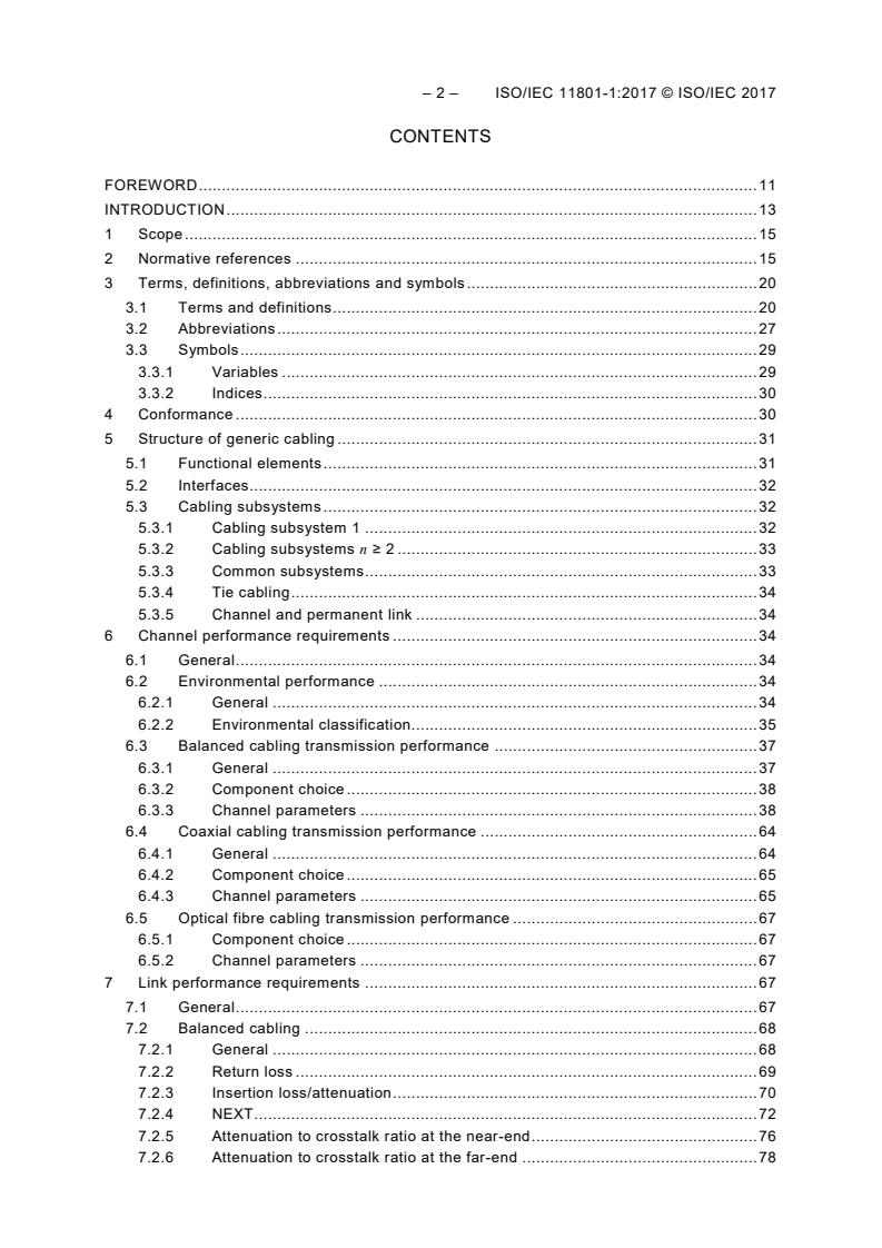 The standard establishes foundational requirements that apply across the ISO/IEC 11801 series. Major technical topics include: