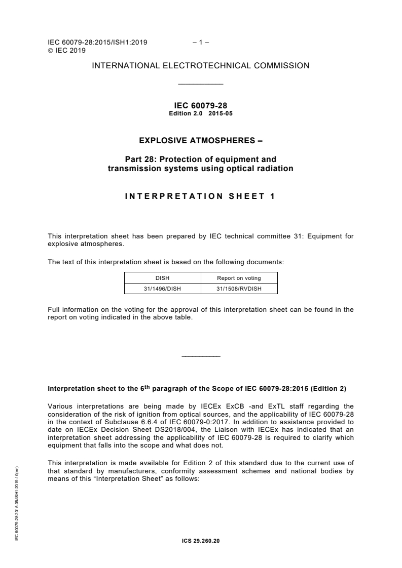 IEC 60079-28:2015 - Explosive atmospheres - Part 28 - Protection of equipment and transmission systems using optical radiation - specifies requirements, testing and marking for equipment that emits optical radiation intended to be used in or to transmit radiation into explosive atmospheres. The edition includes Interpretation Sheet 1 (2019) clarifying applicability with IEC 60079-0. The standard covers Groups I, II and III and Equipment Protection Levels EPLs Ga, Gb, Gc, Da, Db, Dc, Ma and Mb.