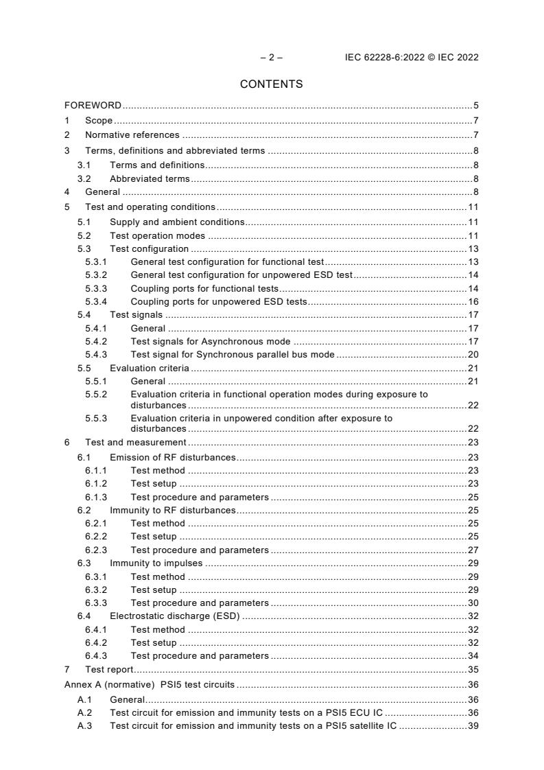IEC 62228-6:2022 specifies test and measurement methods for EMC evaluation of peripheral sensor interface 5 (PSI5) transceiver integrated circuits (ICs) under network condition. It defines test configurations, test conditions, test signals, failure criteria, test procedures, test setups and test boards. It is applicable for PSI5 satellite ICs (e.g. sensors) and ICs with embedded PSI5 transceivers (e.g. PSI5 electronic control unit IC). The document covers the emission of RF disturbances, the immunity against RF disturbances, the immunity against impulses, and the immunity against electrostatic discharges (ESD).
