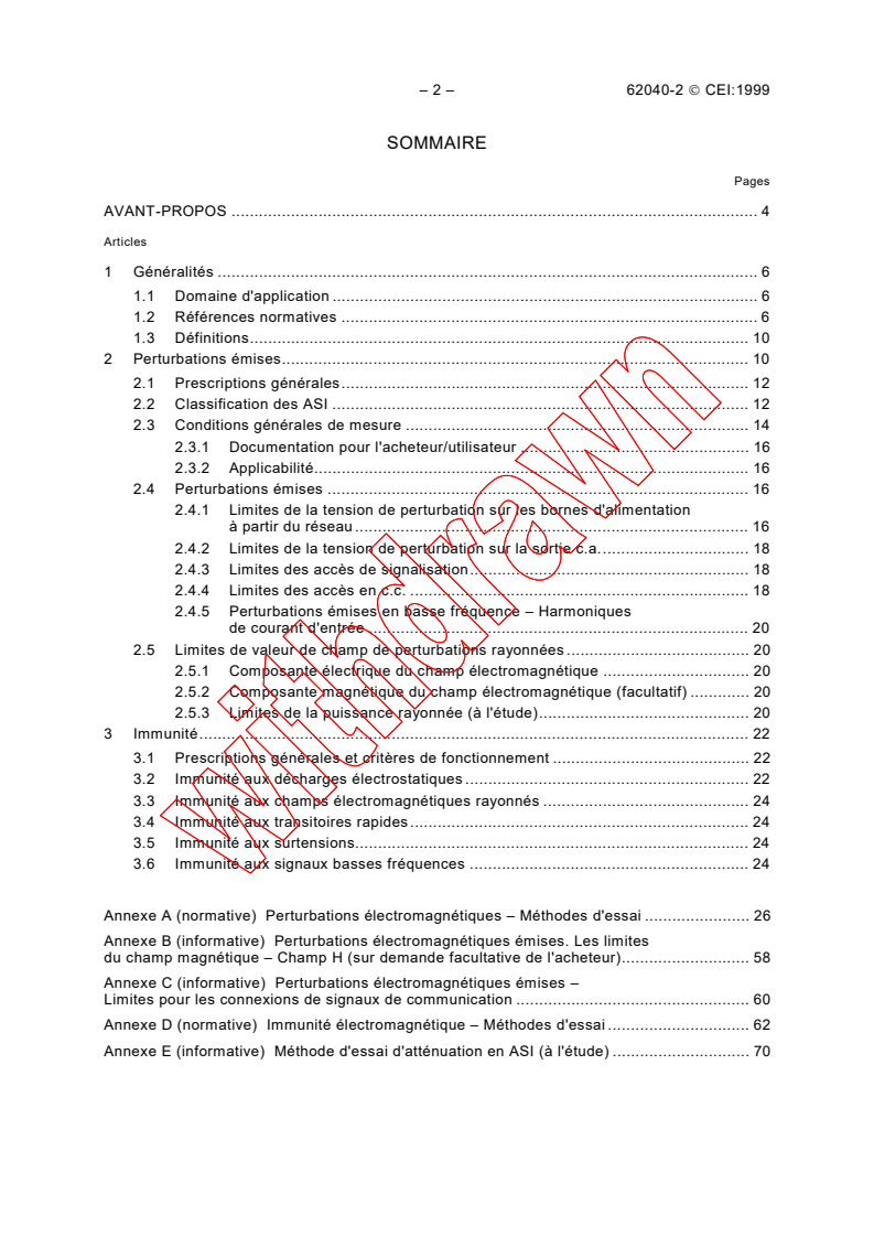 S'applique aux ASI individuelles ou aux systèmes d'ASI comprenant un certain nmbre d'ASI interconnectées et de matériels de commande/commutation formant un système d'alimentation unique, les unes et les autres étant destingées à être installées dans n'impporte quel local accessible à l'opérateur ou dans des locaux séparés et reliés à des réseaux d'alimentation basse tension industriels ou publics. Prévaudra sur tous les aspects des normes génériques; aucun essai complémentaire n'est nécessaire. norme prend en compte les différentes conditions d'essai nécessaires pour couvrir le domaine des ASI en ce qui concerne leurs tailles et leurs puissances nominales. Une ASI unitaire ou un système d'ASI doit satisfaire aux prescriptions appropriées de la présente norme en tant que produit considéré individuellement. Les environnements spéciaux d'installation ne sont pas couverts et les conditions de défaut des ASI ne sont pas non plus pris en compte. La présente norme ne couvre pas les ballasts électroniques alimentés en courant continu (CEI 60924 et CEI 60925) ou les ASI mettant en jeu des machines tournantes. La présente norme fixe les prescriptions de CEM, des méthodes d'essai, des niveaux minimaux de performance.