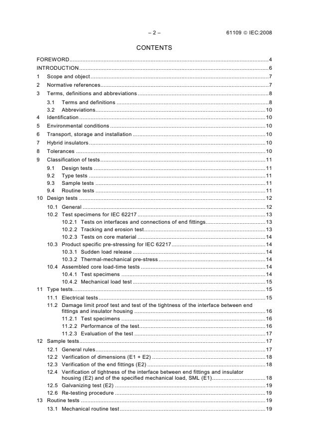 IEC 61109:2008 is a standard published by the International Electrotechnical Commission (IEC). Its full title is "Insulators for overhead lines - Composite suspension and tension insulators for a.c. systems with a nominal voltage greater than 1 000 V - Definitions, test methods and acceptance criteria". This standard covers: IEC 61109:2008 applies to composite suspension/tension insulators consisting of a load-bearing cylindrical insulating solid core consisting of fibres - usually glass - in a resin-based matrix, a housing (outside the insulating core) made of polymeric material and end fittings permanently attached to the insulating core. The main technical changes with respect to the previous edition are - removal of tests procedures now given in IEC 62217; - inclusion of clauses on tolerances, environmental conditions, transport, storage and installation; - general improvement of the description of tests and addition of a new Annex C on non-standard loads.