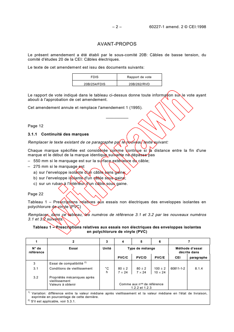Keywords: IEC 60227-1 Amendment 2, PVC insulated cables, low-voltage cables, rated voltage 450/750 V, cable marking continuity, PVC sheath testing, mechanical properties, thermal aging tests, IEC cable standards, lift cables, flexible connection cables, electrical cable safety standards.