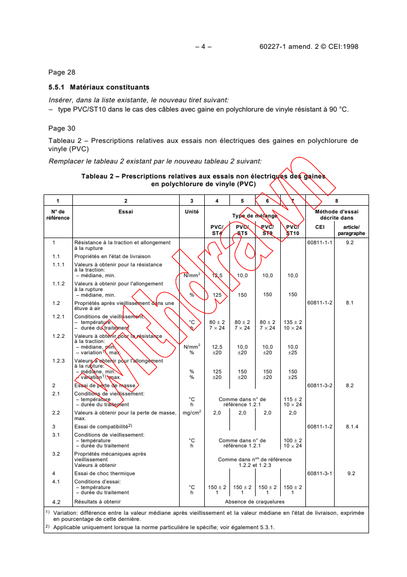 Amendement 2 - Conducteurs et câbles isolés au polychlorure de vinyle, de tension nominale au plus égale à 450/750 V - Partie 1: Prescriptions générales