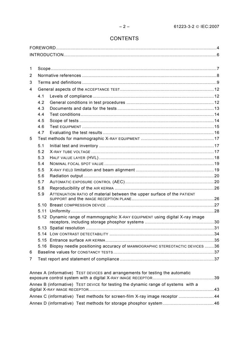 기사 제목: IEC 61223-3-2:2007 - 의료 영상 부서에서의 평가와 정기 검사 - 파트 3-2: 인정 시험 - 유방 조영 X선 장비의 영상 성능 기사 내용: 이 IEC 61223의 이 부분은 유방 조영 X선 장비의 영상 품질과 선량에 관한 효과성에 대한 내용을 다룬다. 이 표준은 유방 조영 X선 장비와 유방 조영 제형 장치에 적용된다. 이 표준에 서술된 시험은 유방 조영 X선 장비의 일부가 아닌 X선 영상 수용기의 품질과 성능을 인정 시험 이전에 보장하기 위해 필요하다. 이에는 방사선 필름, 증광 스크린, 방사선 카세트, 저장 형광 판, 필름 프로세서나 저장 형광 판 판독기, 영상 디스플레이 장치 및 적출력 카메라와 같은 관련 장비가 포함된다. 방사선 카세트와 증광 스크린을 시험하기 위해서는 ISO 4090을 참조한다. 스크린-필름 영상 수용기의 민감도와 대비는 ISO 9236-3에 따라 기술되도록 간주된다. 이 표준에서 설명된 측정을 통해 평균 유선 선량 계산에 필요한 데이터를 산출할 수 있다. 인정 시험의 결과가 기대 값과 일치하는 경우, 이후의 지속성 시험을 위한 기준 값을 설정한다. 이 IEC 61223의 이 부분은 a) 영상 품질과 선량에 관한 유방 조영 X선 장비의 성능을 묘사하는 필수 매개 변수와 b) 측정된 양이 지정된 허용 한계를 충족하는지를 검사하기 위한 시험 방법을 정의한다. 이러한 시험 방법은 주로 설치 중이거나 후에 이루어지며, 적절한 시험 장비를 사용한 비침습 측정에 의존한다. 설치 절차에서 서명된 문서는 인정 시험의 일부로 사용될 수 있다. 높은 수준의 준수를 요구하는 시험은 낮은 수준의 준수를 요구하는 유사한 시험보다 우선한다.