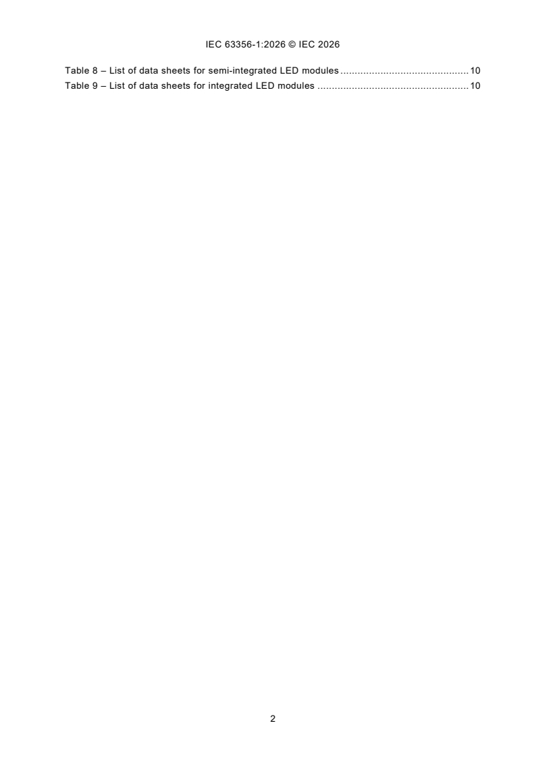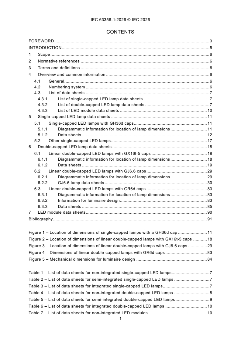 IEC 63356-1:2026 is available as IEC 63356-1:2026 RLV which contains the International Standard and its Redline version, showing all changes of the technical content compared to the previous edition.IEC 63356-1:2026 specifies data sheets of LED lamps and LED modules with a series of parameters per data sheet for a specific LED light source that enables interchangeability between products from different LED light source manufacturers. NOTE Compliance criteria relating to data sheet parameters in this document are covered by IEC 63554 or IEC 62031 for safety, and IEC 63555 for performance. This third edition cancels and replaces the second edition published in 2023. This edition constitutes a technical revision. This edition includes the following significant technical changes with respect to the previous edition: a) addition of datasheets for GJ6.6d-2-x capped LED lamps.
