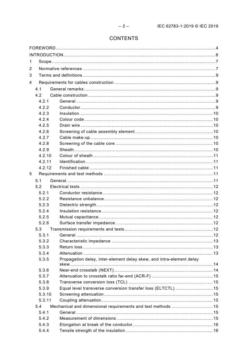 IEC 62783-1:2019 organizes requirements and test methods across electrical, transmission, mechanical and environmental domains. Key topics include: