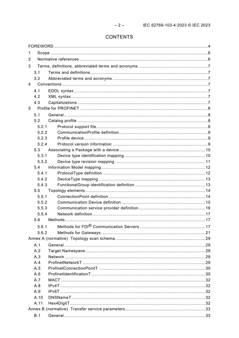 IEC 62769-103-4:2023 specifies an FDI®[1] profile of IEC 62769 for IEC 61784-2_CP 3/4, IEC 61784-2_CP3/5 and IEC 61784-2_CP3/6 (PROFINET[2]).