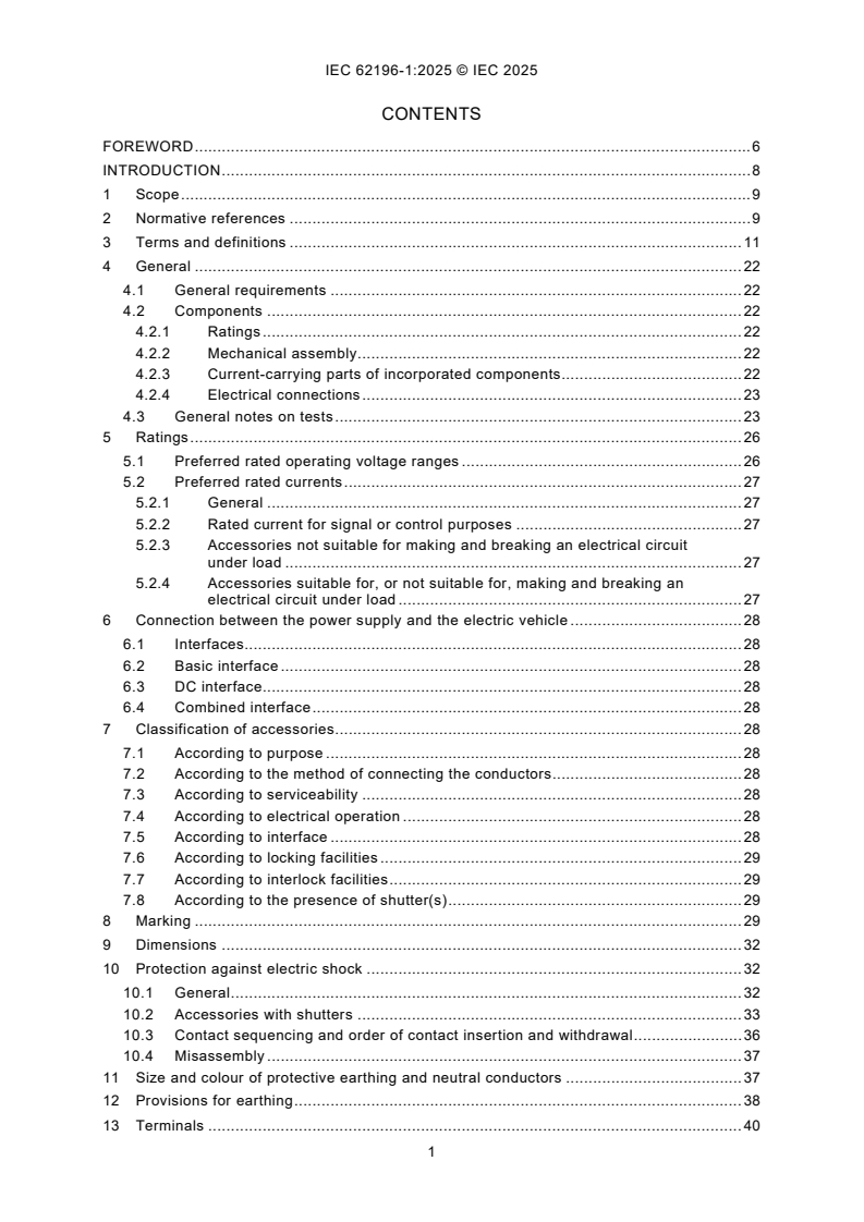 IEC 62196-1:2025 is a standard published by the International Electrotechnical Commission (IEC). Its full title is "Plugs, socket-outlets, vehicle connectors and vehicle inlets - Conductive charging of electric vehicles - Part 1: General requirements". This standard covers: IEC 62196-1:2025 is applicable to EV plugs, EV socket-outlets, vehicle connectors, vehicle inlets, herein referred to as "accessories", and to cable assemblies for electric vehicles (EV) intended for use in conductive charging systems which incorporate control means, with a rated operating voltage not exceeding - 690 V AC 50 Hz to 60 Hz, at a rated current not exceeding 250 A, and - 1 500 V DC at a rated current not exceeding 800 A. This fifth edition cancels and replaces the fourth edition published in 2022. This edition constitutes a technical revision. This edition includes the following significant technical changes with respect to the previous edition: a) addition of new tests for latching devices and retaining means; b) inclusion of type 4 accessories.