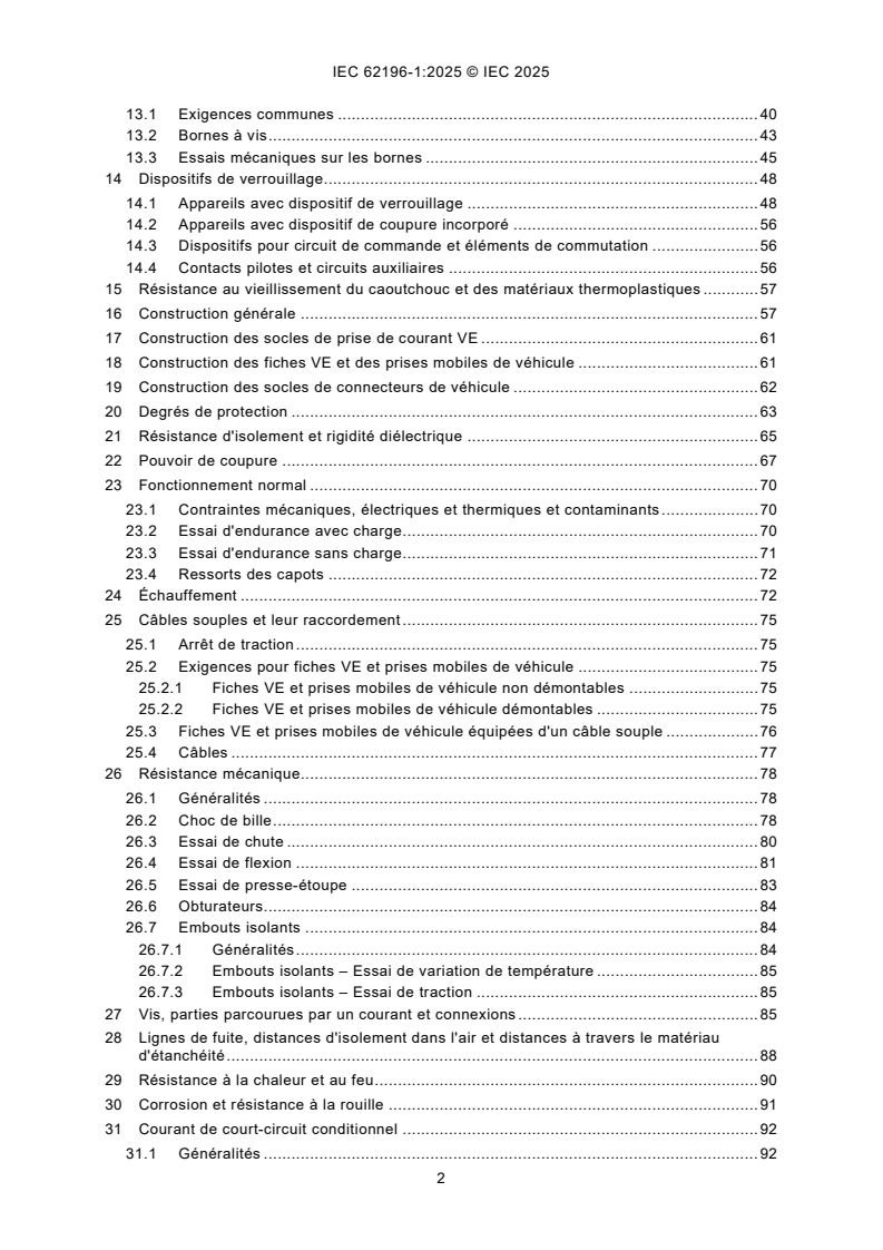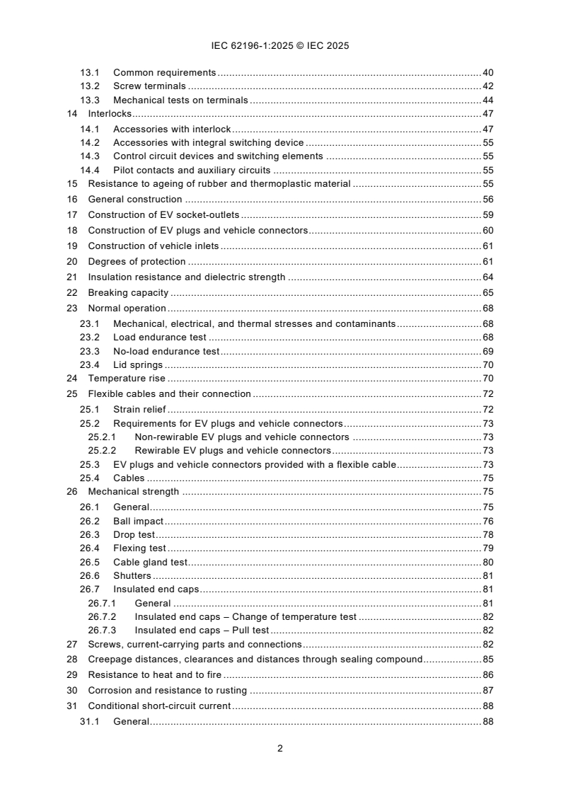 IEC 62196-1:2025 is applicable to EV plugs, EV socket-outlets, vehicle connectors, vehicle inlets, herein referred to as "accessories", and to cable assemblies for electric vehicles (EV) intended for use in conductive charging systems which incorporate control means, with a rated operating voltage not exceeding - 690 V AC 50 Hz to 60 Hz, at a rated current not exceeding 250 A, and - 1 500 V DC at a rated current not exceeding 800 A. This fifth edition cancels and replaces the fourth edition published in 2022. This edition constitutes a technical revision. This edition includes the following significant technical changes with respect to the previous edition: a) addition of new tests for latching devices and retaining means; b) inclusion of type 4 accessories.
