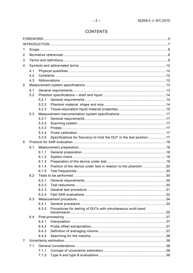 IEC 62209-2:2010 is a standard published by the International Electrotechnical Commission (IEC). Its full title is "Human exposure to radio frequency fields from hand-held and body-mounted wireless communication devices - Human models, instrumentation, and procedures - Part 2: Procedure to determine the specific absorption rate (SAR) for wireless communication devices used in close proximity to the human body (frequency range of 30 MHz to 6 GHz)". This standard covers: IEC 62209-2:2010 is applicable to any wireless communication device capable of transmitting electromagnetic fields (EMF) intended to be used at a position near the human body, in the manner described by the manufacturer, with the radiating part(s) of the device at distances up to and including 200 mm from a human body, i.e. when held in the hand or in front of the face, mounted on the body, combined with other transmitting or non-transmitting devices or accessories (e.g. belt-clip, camera or Bluetooth add-on), or embedded in garments. For transmitters used in close proximity to the human ear, the procedures of IEC 62209-1:2005 are applicable. IEC 62209-2:2010 is applicable for radio frequency exposure in the frequency range of 30 MHz to 6 GHz, and may be used to measure simultaneous exposures from multiple radio sources used in close proximity to human body. Definitions and evaluation procedures are provided for the following general categories of device types: - body-mounted, - body-supported, - desktop, - front-of-face, - hand-held, - laptop, - limb-mounted, - multi-band, - push-to-talk, - clothing-integrated. The types of devices considered include but are not limited to mobile telephones, cordless microphones, auxiliary broadcast devices and radio transmitters in personal computers. IEC 62209-2:2010 gives guidelines for a reproducible and conservative measurement methodology for determining the compliance of wireless devices with the SAR limits. The contents of the corrigendum of June 2010 have been included in this copy.