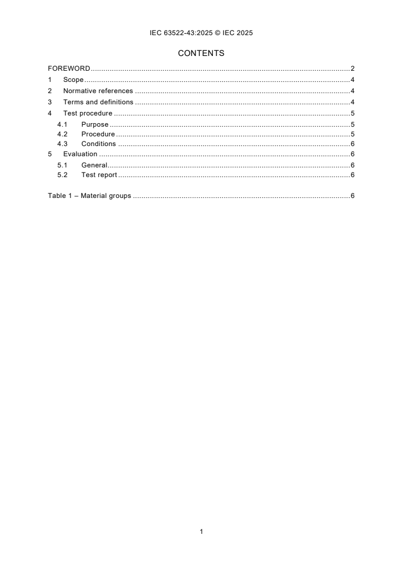 IEC 63522-43:2025 This document is used for testing along with the appropriate severities and conditions for measurements and tests designed to assess the ability of specimens to perform under expected conditions of transportation, storage and all aspects of operational use. This document defines a standard test method for evaluation of appropriate materials having appropriate values of tracking resistance.