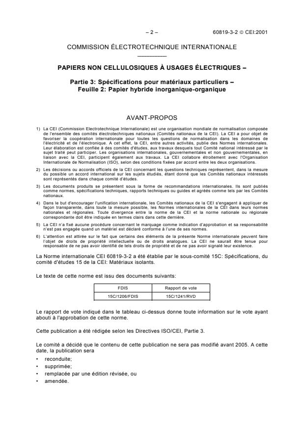 IEC 60819-3-2:2001 is an international standard published by the International Electrotechnical Commission (IEC) that specifies requirements for a specialized type of non-cellulosic paper used in electrical applications. This paper, known as hybrid inorganic-organic paper and designated as P-H, is manufactured from polyethylene-terephthalate (PET) fibers filled with aluminium silicates. The standard forms part of the broader IEC 60819 series, which addresses specifications, testing methods, and general requirements for non-cellulosic papers used in electrical insulation and related purposes.