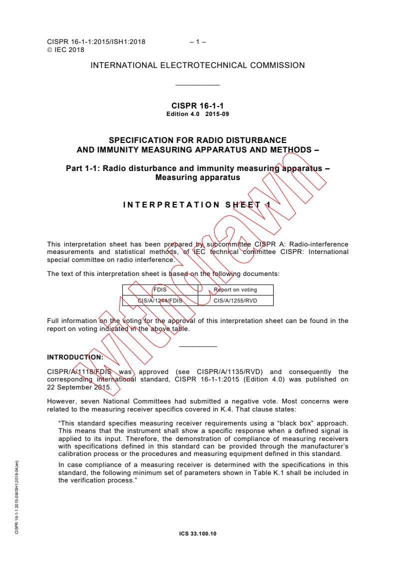 CISPR 16-1-1:2015 is a standard published by the International Electrotechnical Commission (IEC). Its full title is "Specification for radio disturbance and immunity measuring apparatus and methods - Part 1-1: Radio disturbance and immunity measuring apparatus - Measuring apparatus". This standard covers: CISPR 16-1-1:2015 specifies the characteristics and performance of equipment for the measurement of radio disturbance in the frequency range 9 kHz to 18 GHz. In addition, requirements are provided for specialized equipment for discontinuous disturbance measurements. This fourth edition cancels and replaces the third edition published in 2010, Amendment 1:2010 and Amendment 2:2014. This edition constitutes a technical revision. The contents of the interpretation sheet 1 of April 2018 have been included in this copy.