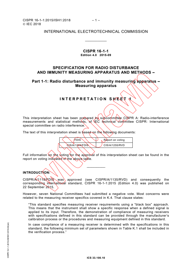 CISPR 16-1-1:2015 - Specification for radio disturbance and immunity measuring apparatus and methods (Part 1-1: Measuring apparatus) is an IEC/CISPR standard that defines the characteristics and performance requirements for equipment used to measure radio disturbance. It covers measurement apparatus operating in the frequency range 9 kHz to 18 GHz, and includes requirements for specialized equipment used in discontinuous disturbance measurements. Edition 4.0 (2015) is a technical revision that supersedes earlier editions and incorporates Interpretation Sheet 1 (April 2018).