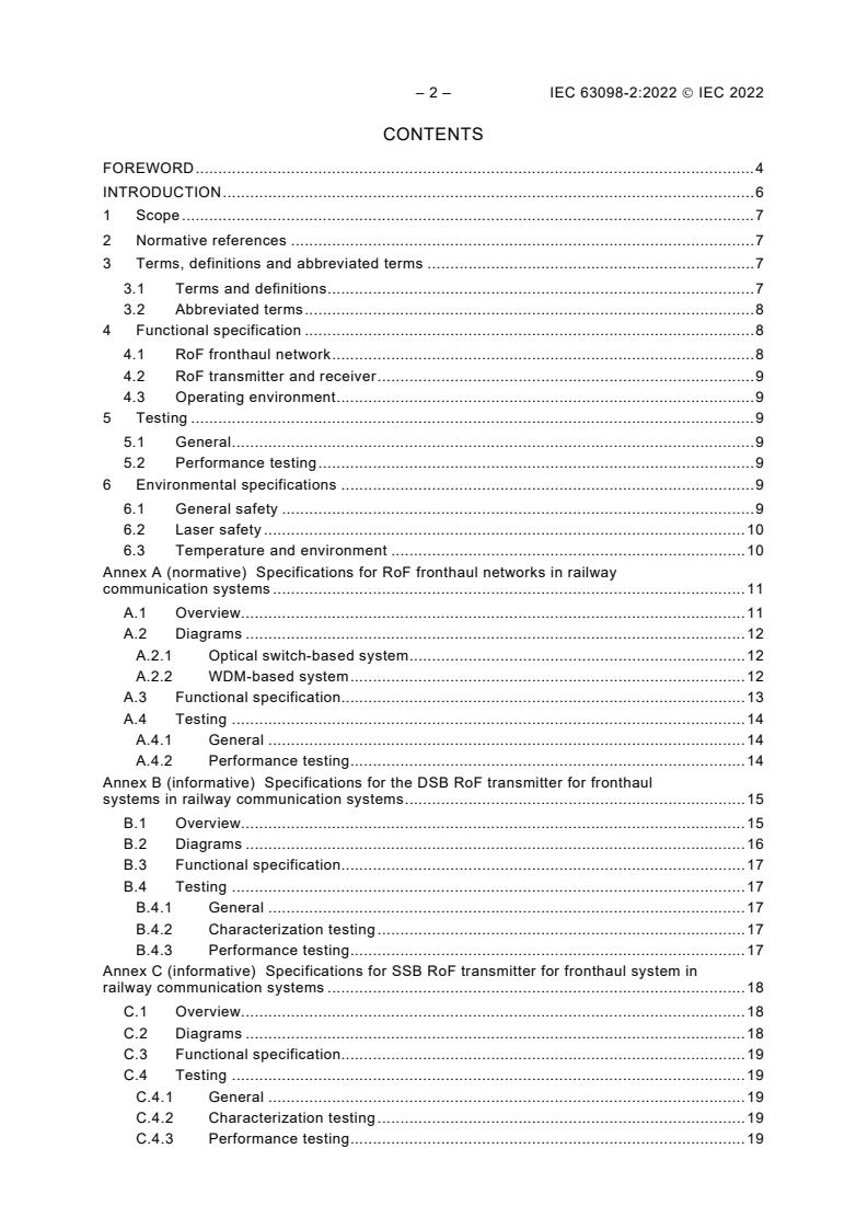 Keywords: IEC 63098-2:2022, radio-over-fibre, RoF fronthaul network, railway communication systems, RoF transmitter, RoF receiver, WDM-based fronthaul, optical-switch fronthaul, DSB, SSB, mm-wave fronthaul.